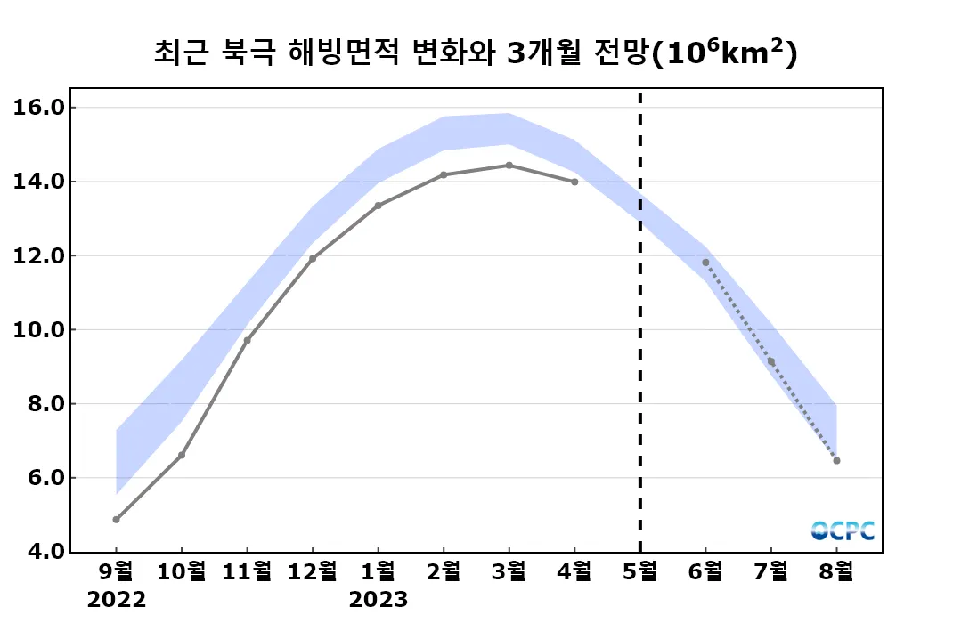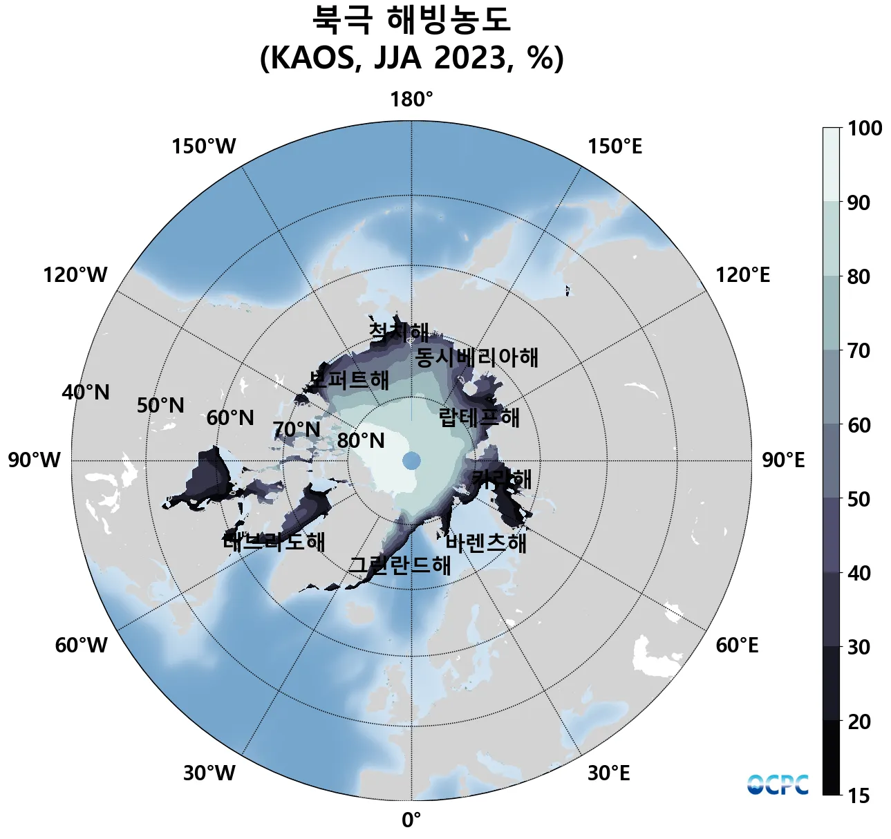 A. 북극 해빙농도 전망(2023년 6~8월 평균, 15% 이상 해역)