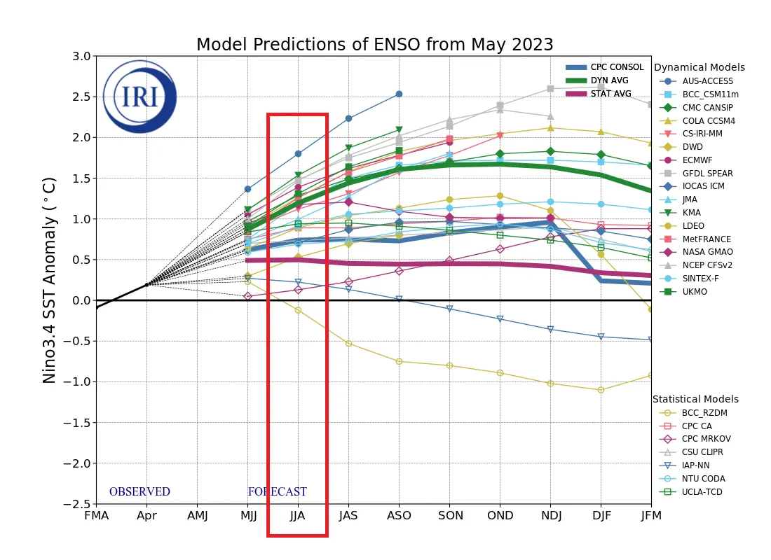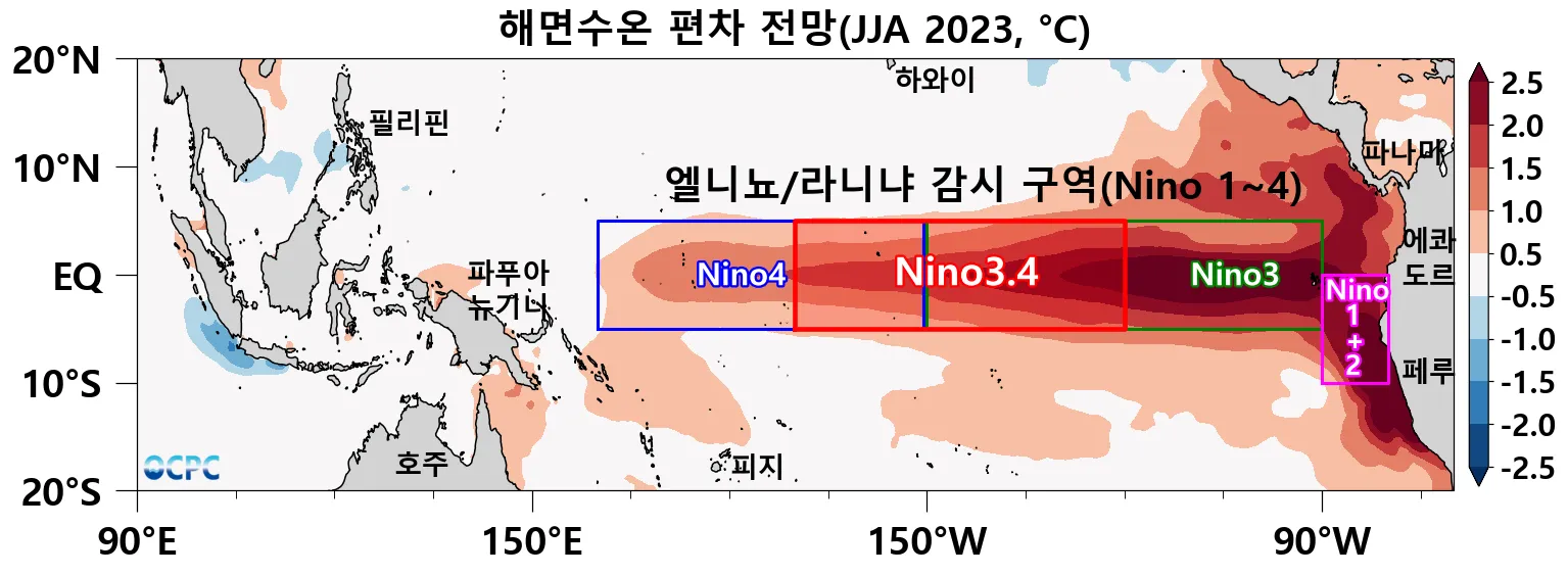 엘니뇨/라니냐 감시구역인 Nino3.4 해역(5°S~5°N, 170°W~120°W)의 6~8월(JJA) 평균 해면수온 편차는 0.5°C 이상으로 엘니뇨 상태일 것으로 전망됩니다.