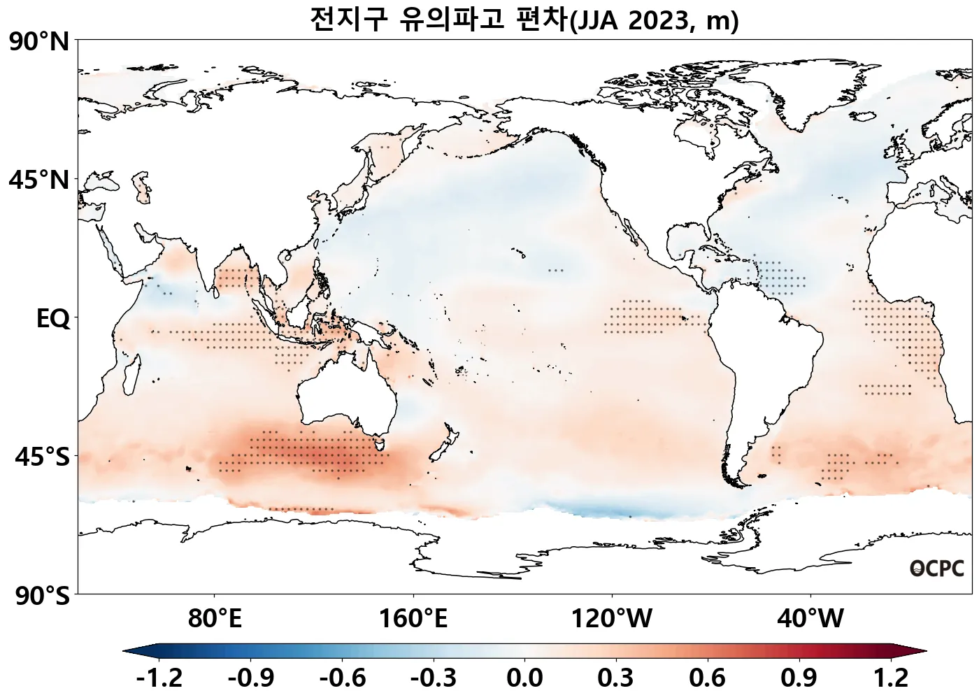 A-B. 전지구 유의파고 편차 전망(2023년 6~8월 평균, 점표시: 평년 표준편차 초과 해역)