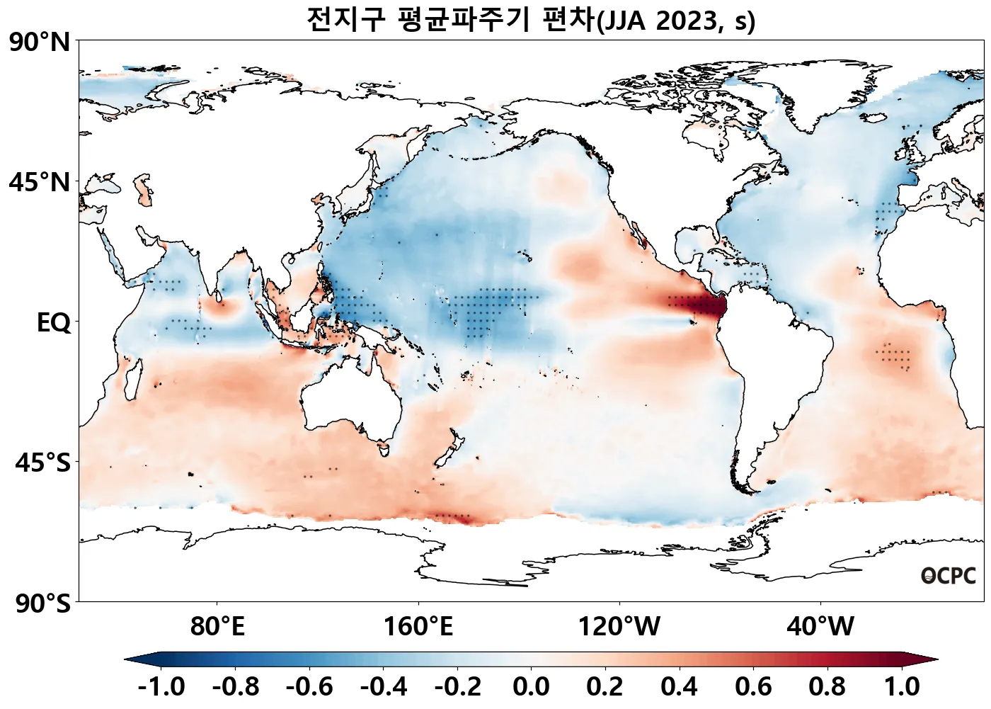 A-B. 전지구 평균파주기 편차 전망(2023년 6~8월 평균, 점표시: 평년 표준편차 초과 해역)