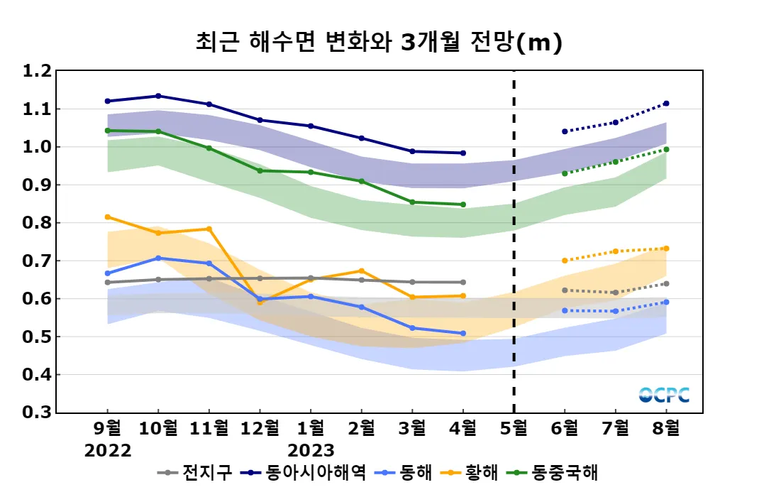 동해, 황해, 동중국해의 6~8월 평균 해수면은 평년(0.51±0.06m, 0.65±0.06m, 0.90±0.06m)보다 높겠습니다.
