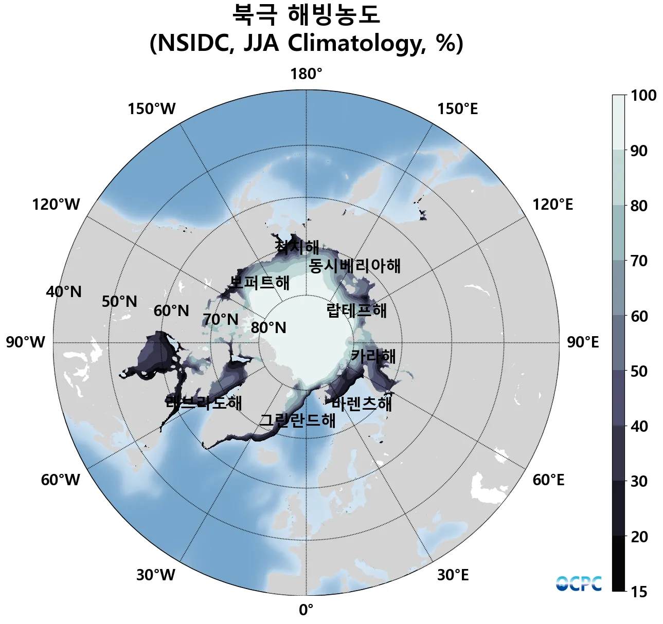 B. 북극 해빙농도(평년 6~8월 평균, 15% 이상 해역)
