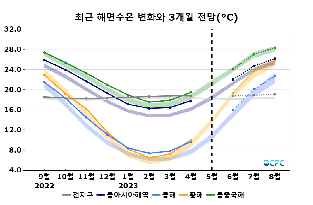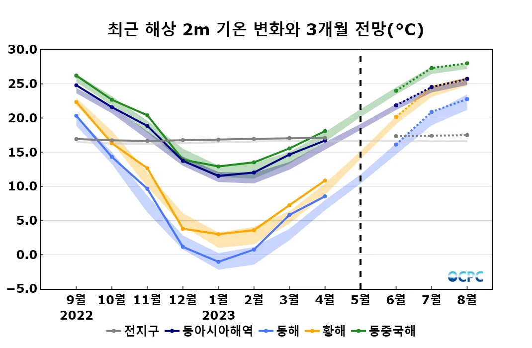 동아시아해역의 6~8월 평균 해상기온은 평년(23.6±0.4℃)보다 높겠습니다.