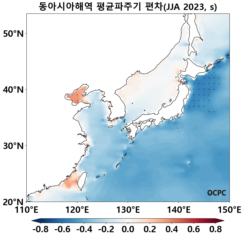 A-B. 동아시아해역 평균파주기 편차 전망(2023년 6~8월 평균, 점표시: 평년 표준편차 초과 해역)