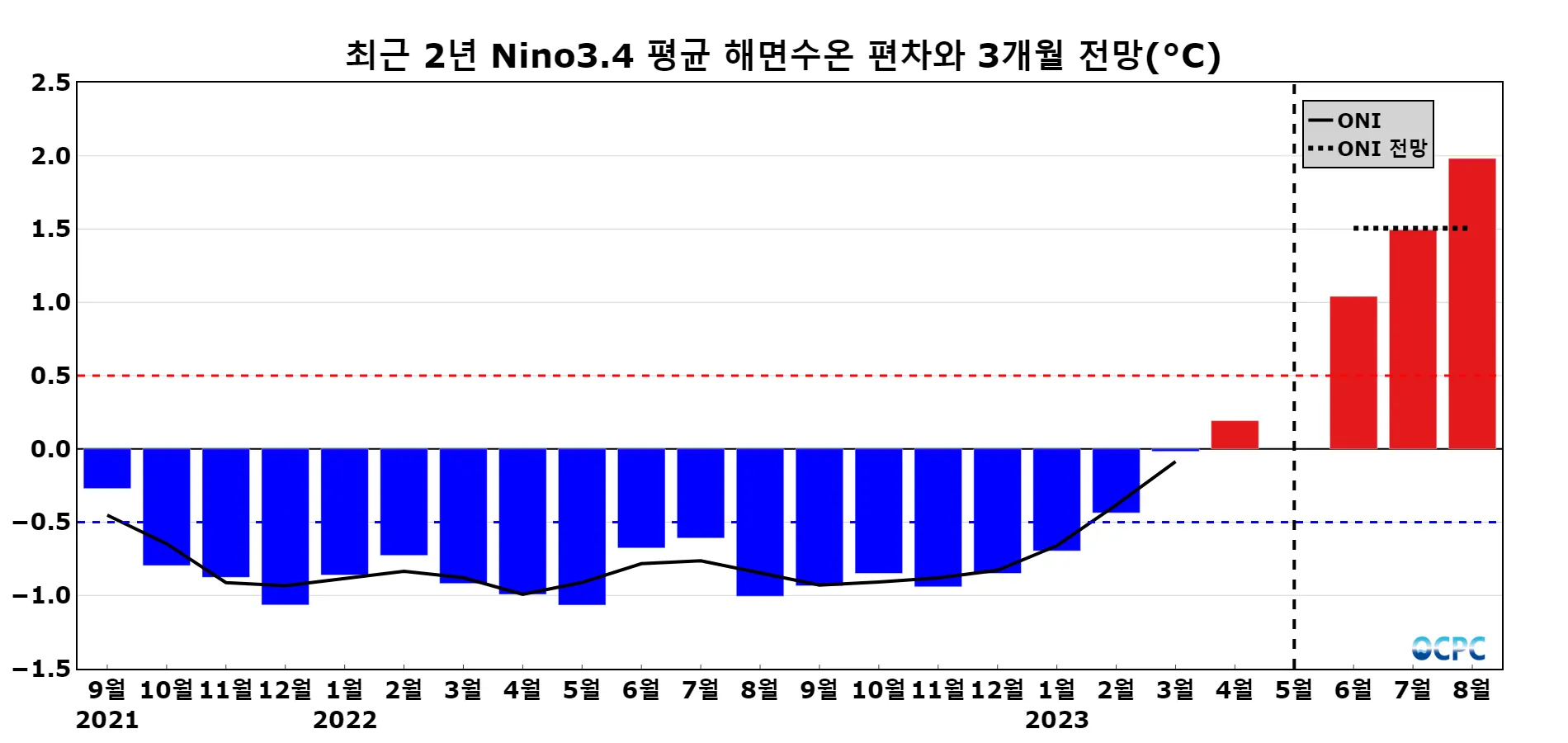 엘니뇨/라니냐 지수(ONI, Ocean Nino Index): 엘니뇨/라니냐 감시구역인 Nino3.4 해역의 월평균 해면수온 편차(채색부분)를 3개월 이동평균하여 나타낸 지수(검정색 실선)로 0.5보다 크면 엘니뇨, -0.5보다 작으면 라니냐로 판정합니다. 과거 지수(최근 2년)는 OISSTv2.1, 전망은 CFSv2 자료에서 산출하였으며, 검정색 점선은 3개월 전망의 평균값을 나타냅니다.