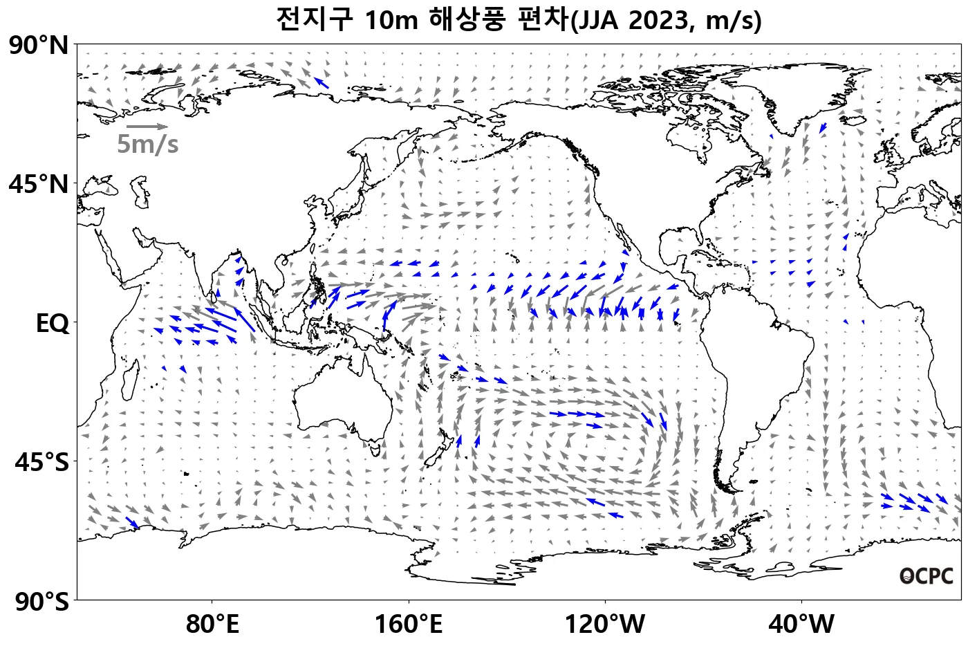 A-B. 전지구 해상풍 편차 전망(2023년 6~8월 평균, 청색벡터: 평년 표준편차 초과 해역)