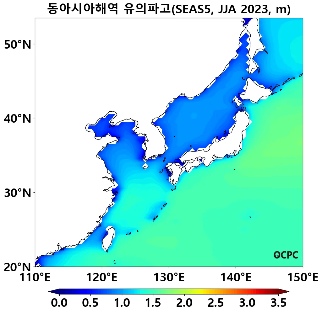 A. 동아시아해역 유의파고 전망(2023년 6~8월 평균)
