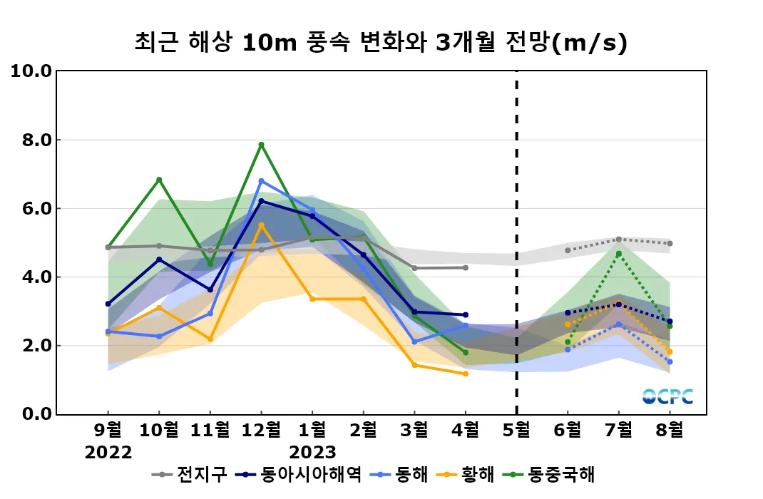 동아시아해역의 6~8월 평균 해상풍속은 평년(2.8±0.4m/s)과 비슷하겠습니다.