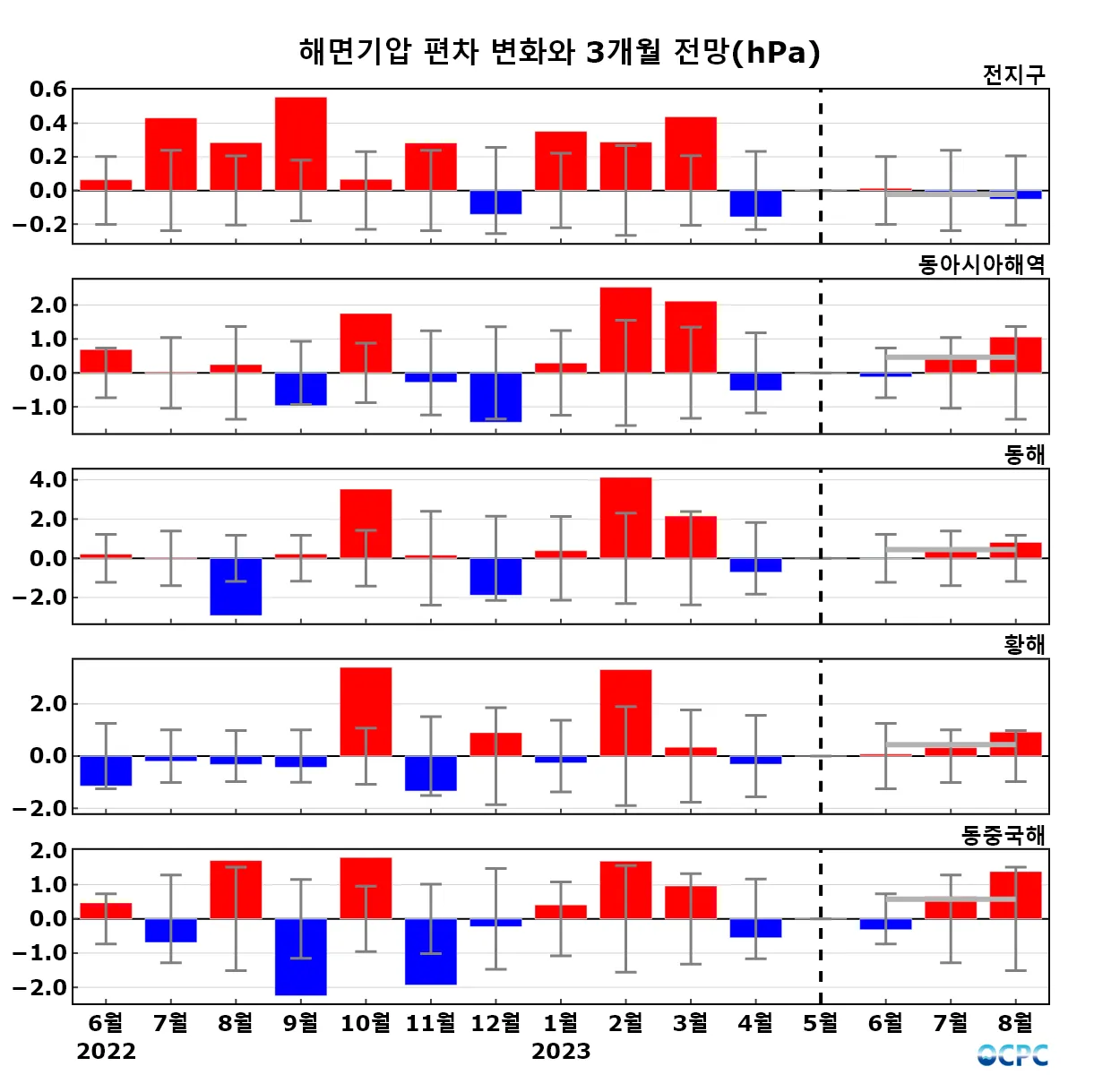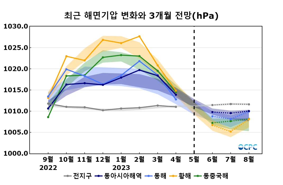 동해, 황해, 동중국해의 6~8월 평균 해면기압은 평년(1008.5±1.3hPa, 1006.2±1.1hPa, 1007.1±1.2hPa)과 비슷하겠습니다.