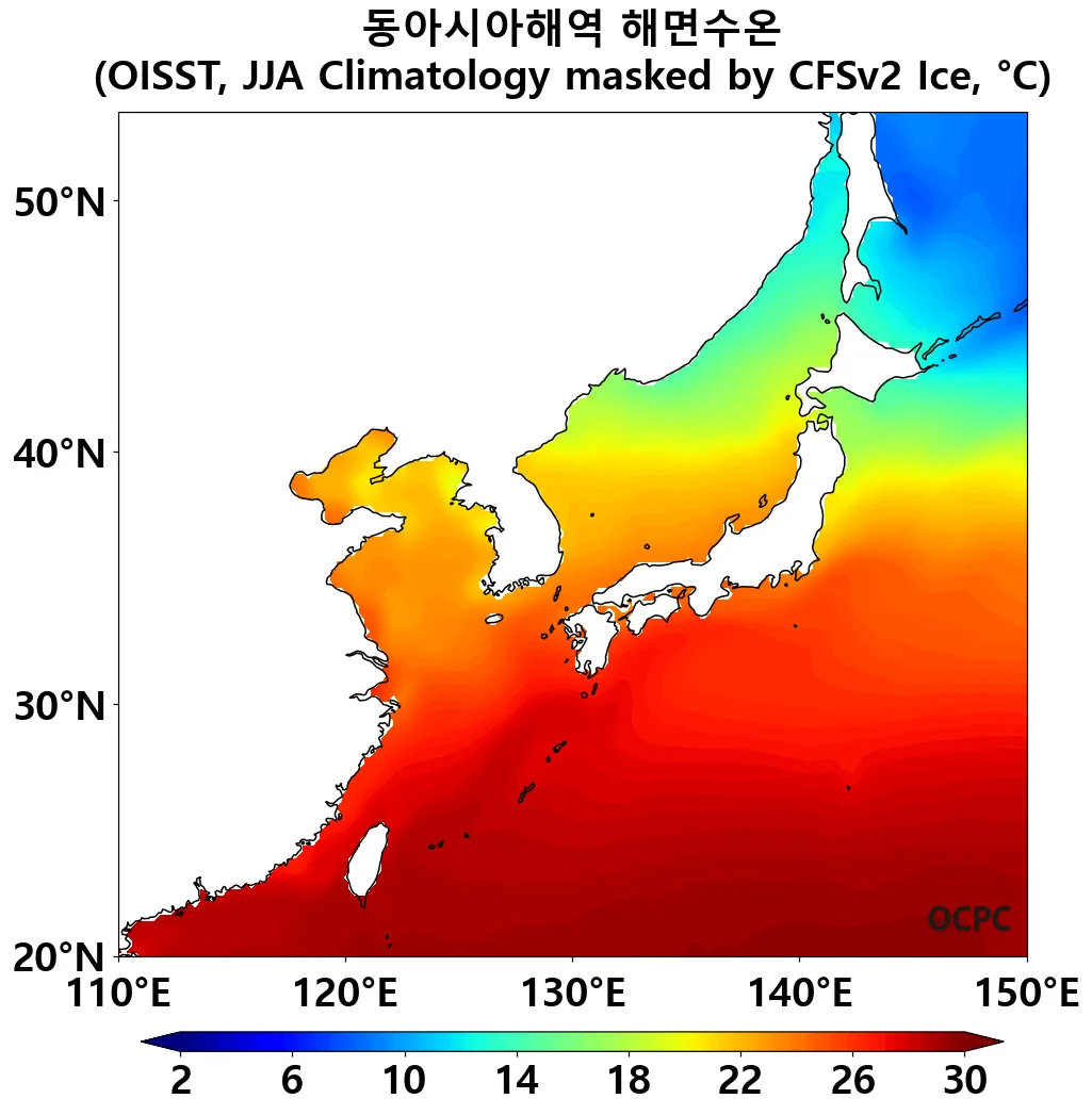 B. 동아시아해역 해면수온(평년 6~8월 평균), 예상 해빙 해역 제외