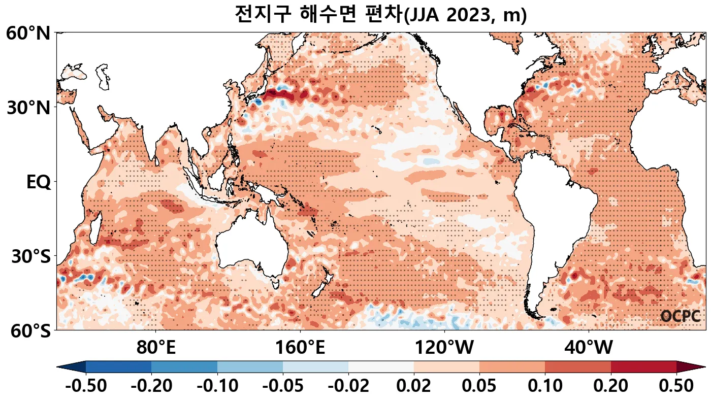 A-B. 전지구 해수면 편차 전망(2023년 6~8월 평균, 점표시: 평년 표준편차 초과 해역)