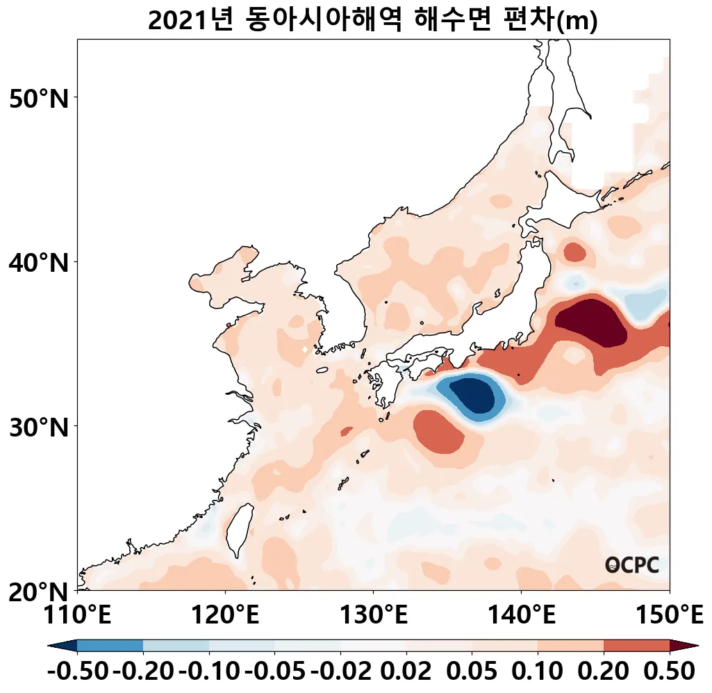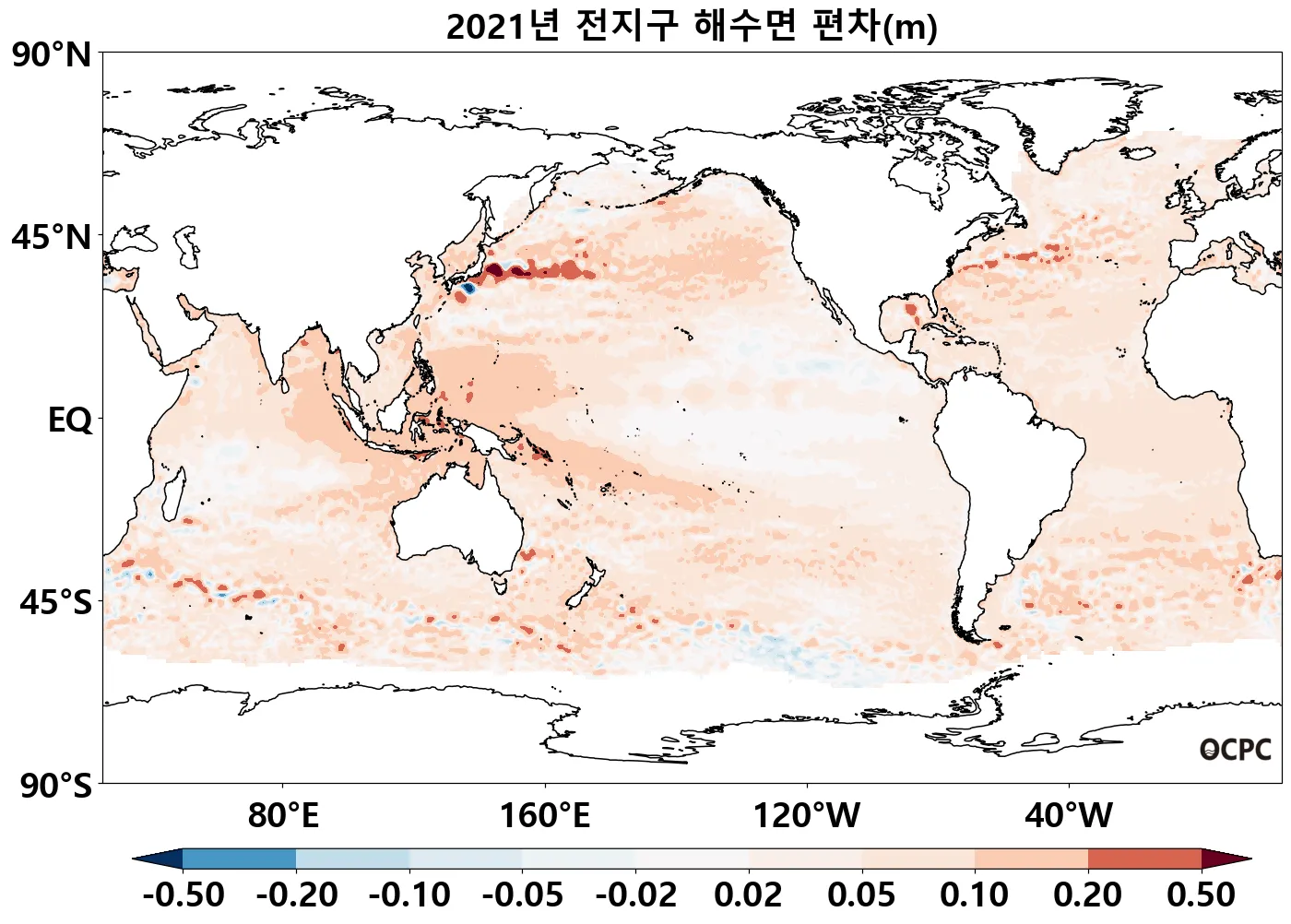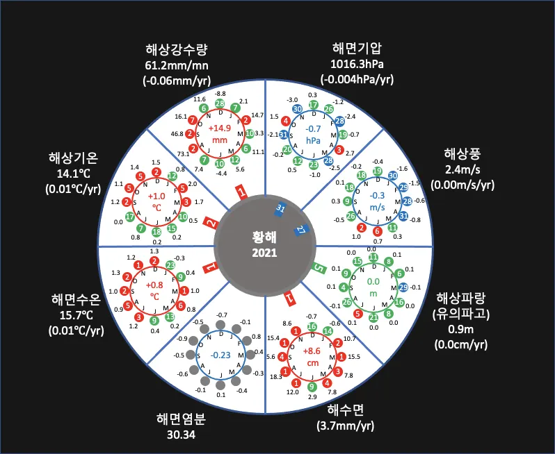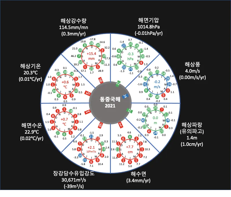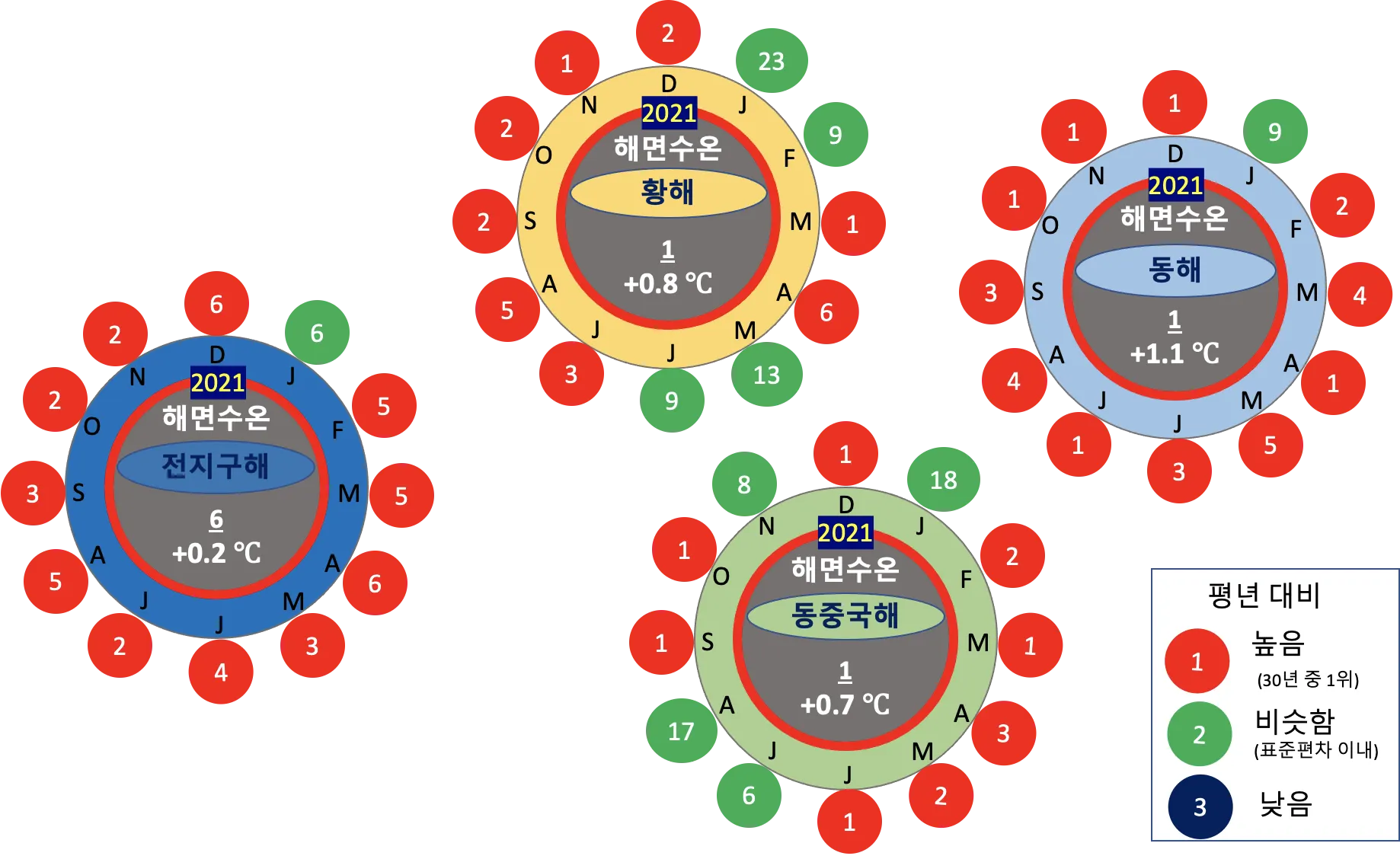 2021년 연평균 해양기후는 해면수온과 해수면이 우리나라 주변해역에서 모두 역대 최고를 기록했다.