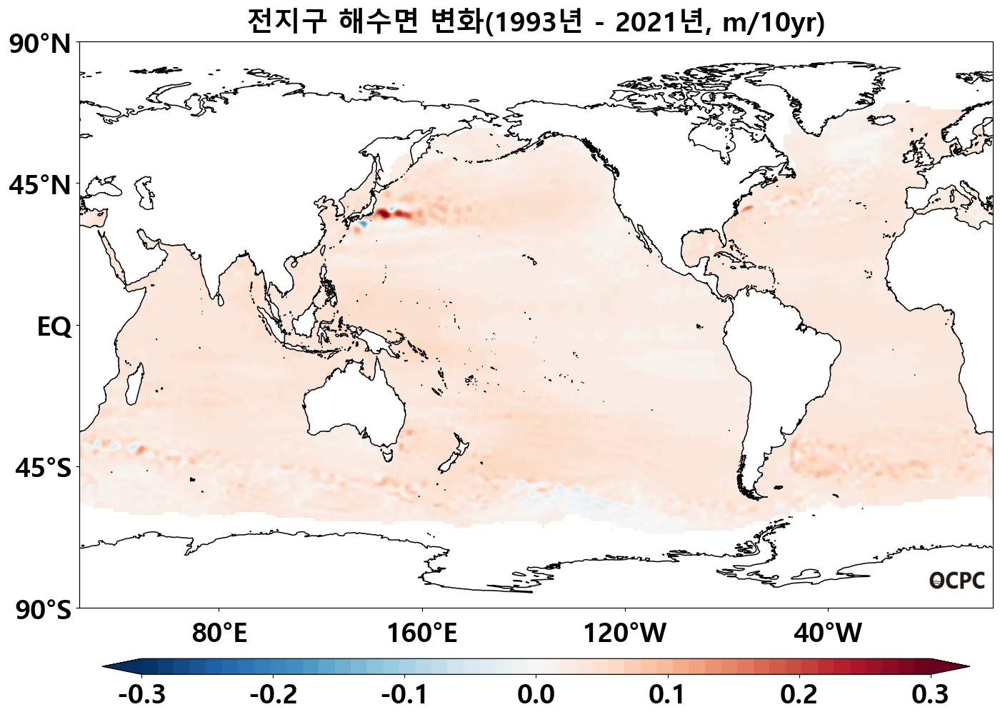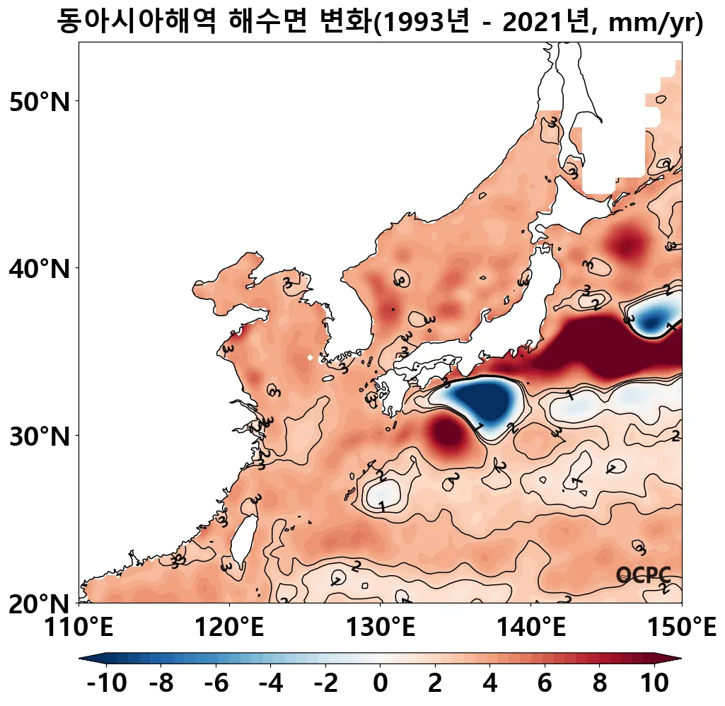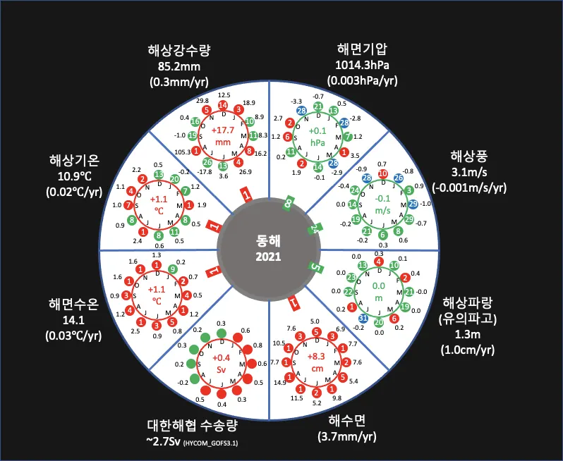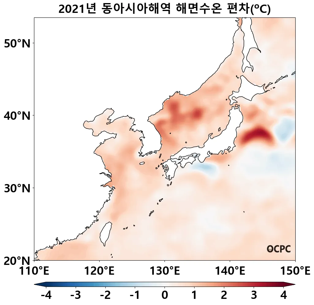 2021년 연평균 해양기후는 해면수온과 해수면이 우리나라 주변해역에서 모두 역대 최고를 기록했다.
