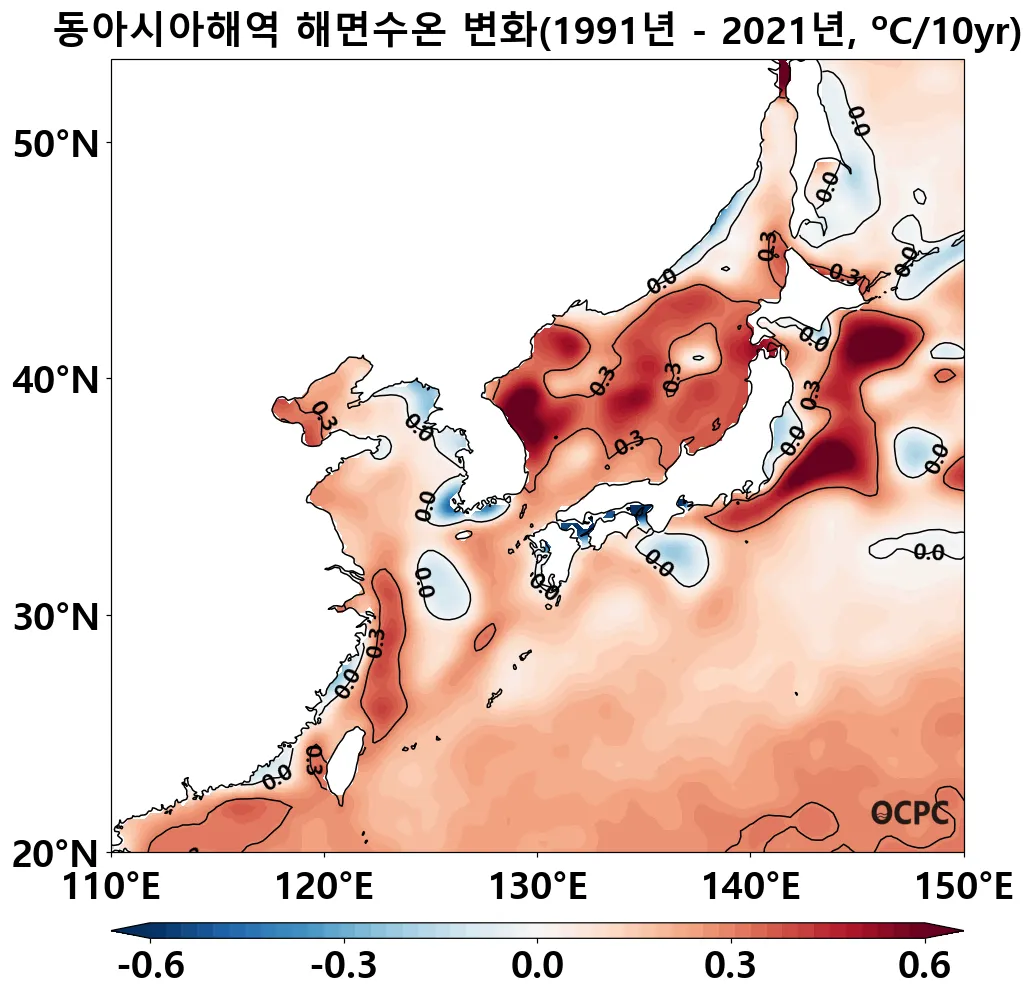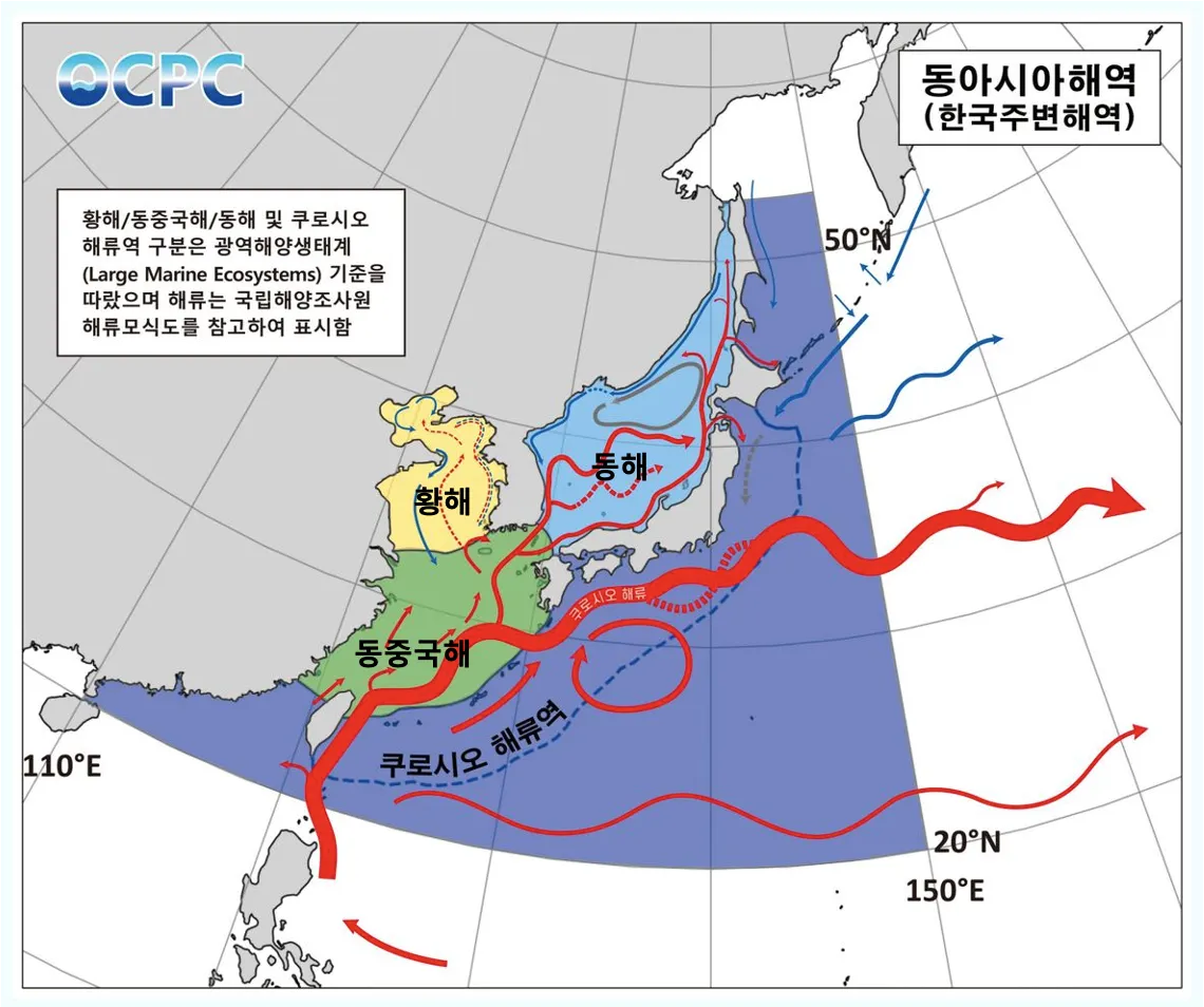 평년 평균에 해당하는 해양기후는 위성 및 재분석 자료를 토대로 해양기후 핵심변수들에 대한 장기(~30년) 월(연)평균장으로 정의했으며, 우리나라 주변 지역해를 광역해양생태계(Large Marine Ecosystems) 기준에 따라 황해, 동중국해, 동해로 구분하여 영역 평균값을 산출하였다.