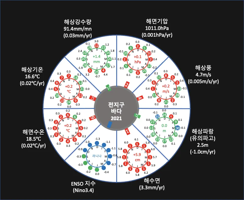 2021년 월별 편차를 높음(적색), 보통(녹색), 낮음(청색)으로 표시하였고, 그 안의 숫자는 30년 중 순위에 해당하며, 그 위의 숫자는 월편차입니다. 큰원 밖의 숫자는 변수별 연평균과 연추세이고 중앙의 작은 원 밖 막대는 연평균의 판정색과 순위입니다.