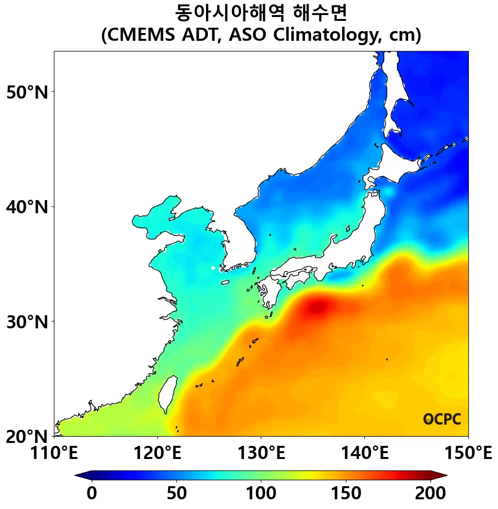 해수면 높이는 가상의 지오이드면(Geoid, 중력포텐셜이 같은 면)을 기준으로 환산한 절대 해수면 높이(Absolute Dynamic Topography, ADT)로서 절댓값 보다는 상대적인 변화와 차이가 더 중요합니다.