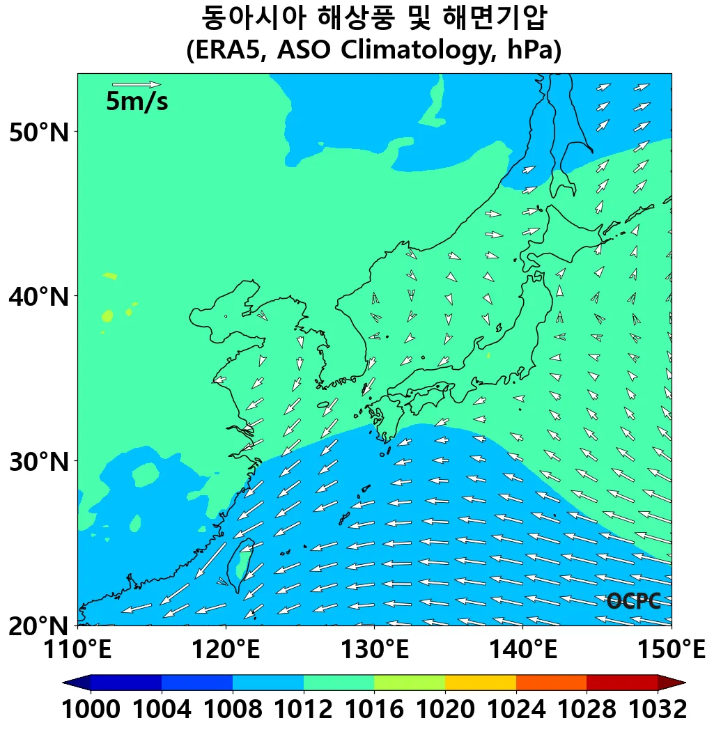B. 동아시아 해상풍 및 해면기압(평년 8월~10월 평균)
