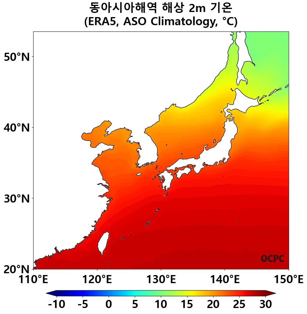 동아시아해역의 8~10월 평균 해상기온은 평년(23.7±0.2℃)보다 높겠습니다.