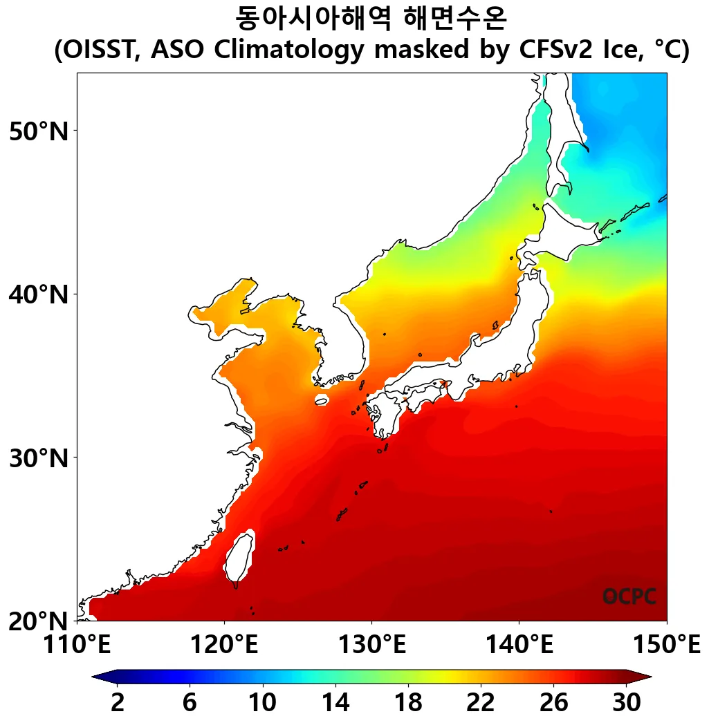 B. 동아시아해역 해면수온(평년 8월~10월 평균), 예상 해빙 해역 제외