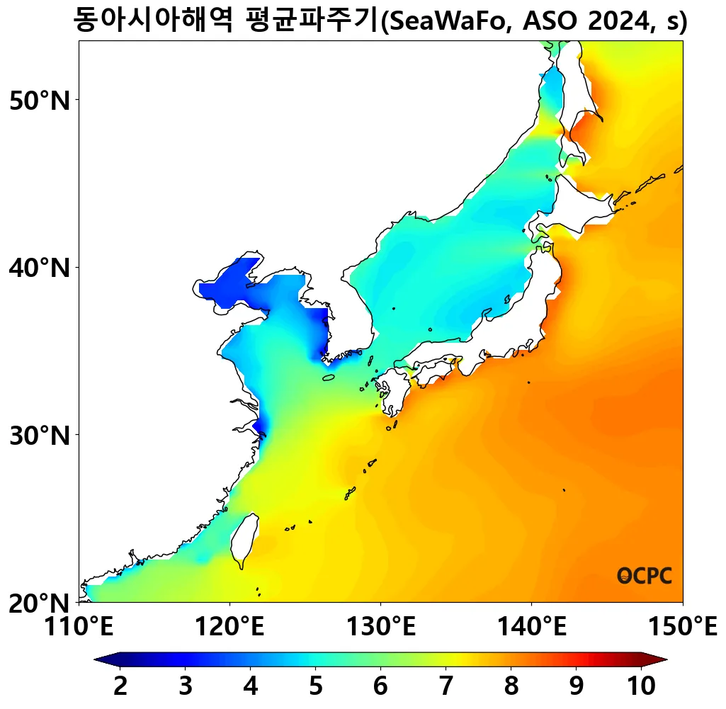 동아시아해역의 8~10월 평균파주기는 평년(7.29±0.08초)보다 0.23초 감소할 것으로 전망됩니다.