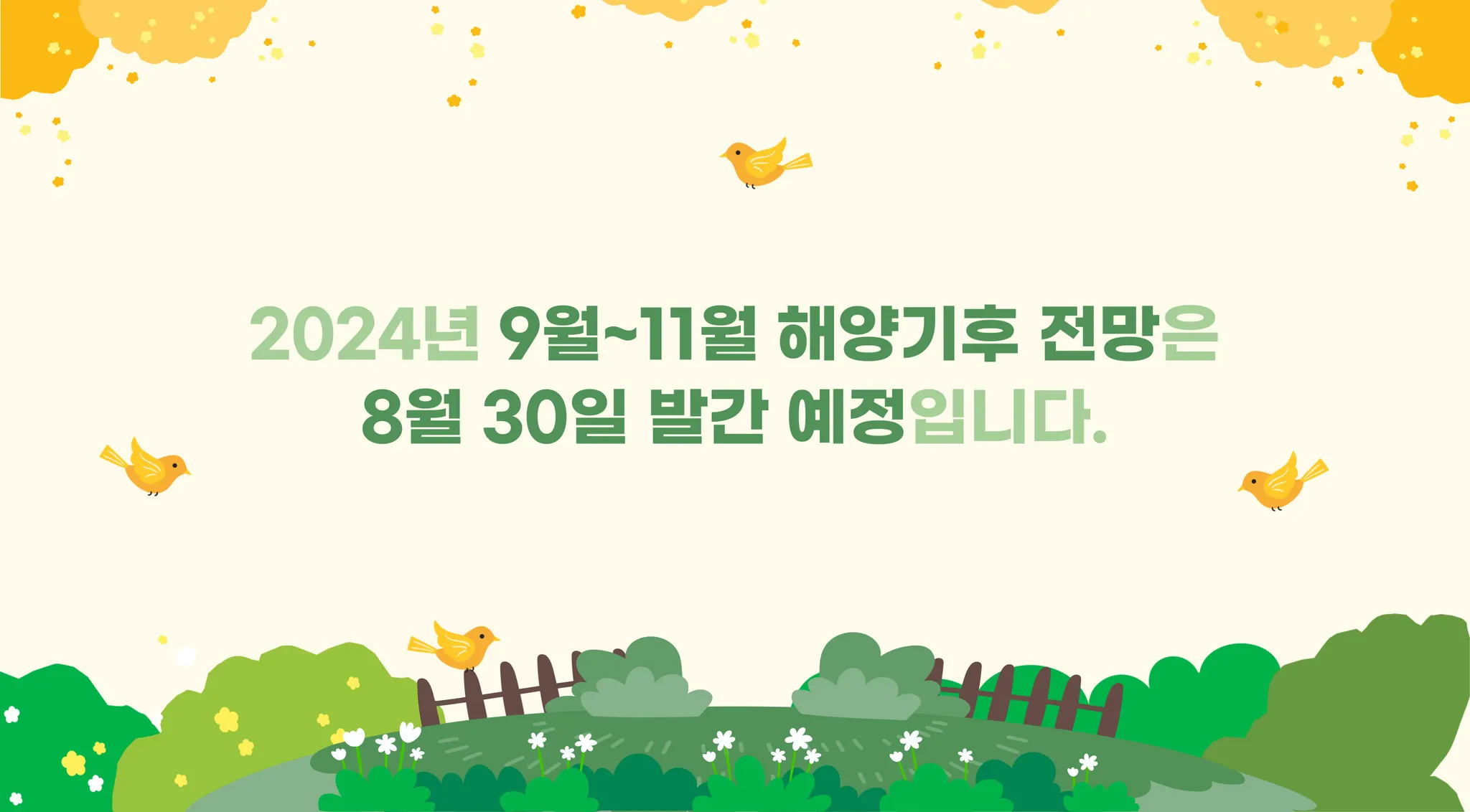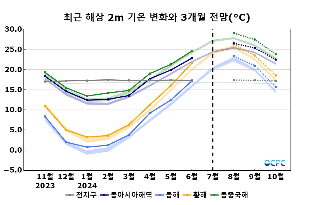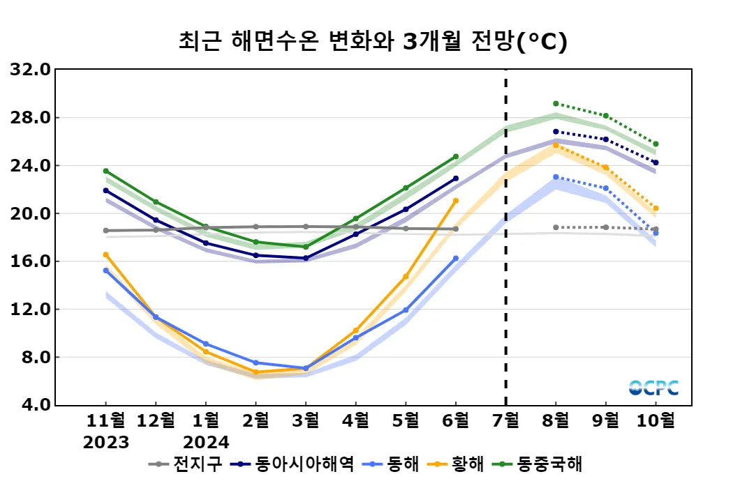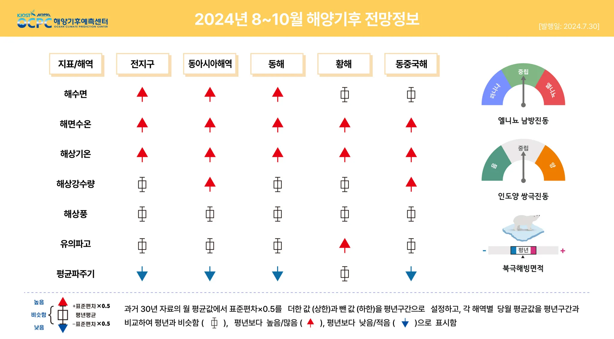 3개월(8, 9, 10월) 평균 전망: 해수면, 해면수온, 해상기온은 전지구, 동아시아해역에서 평년보다 높겠으며, 북극 해빙면적은 평년과 비슷하겠습니다. 열대 태평양에 라니냐가 발생할 것으로 전망됩니다.