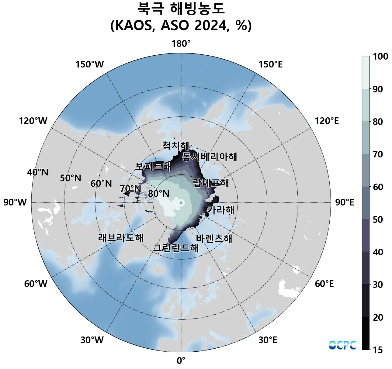 A. 북극 해빙농도 전망(2024년 8월~10월 평균, 15% 이상 해역)