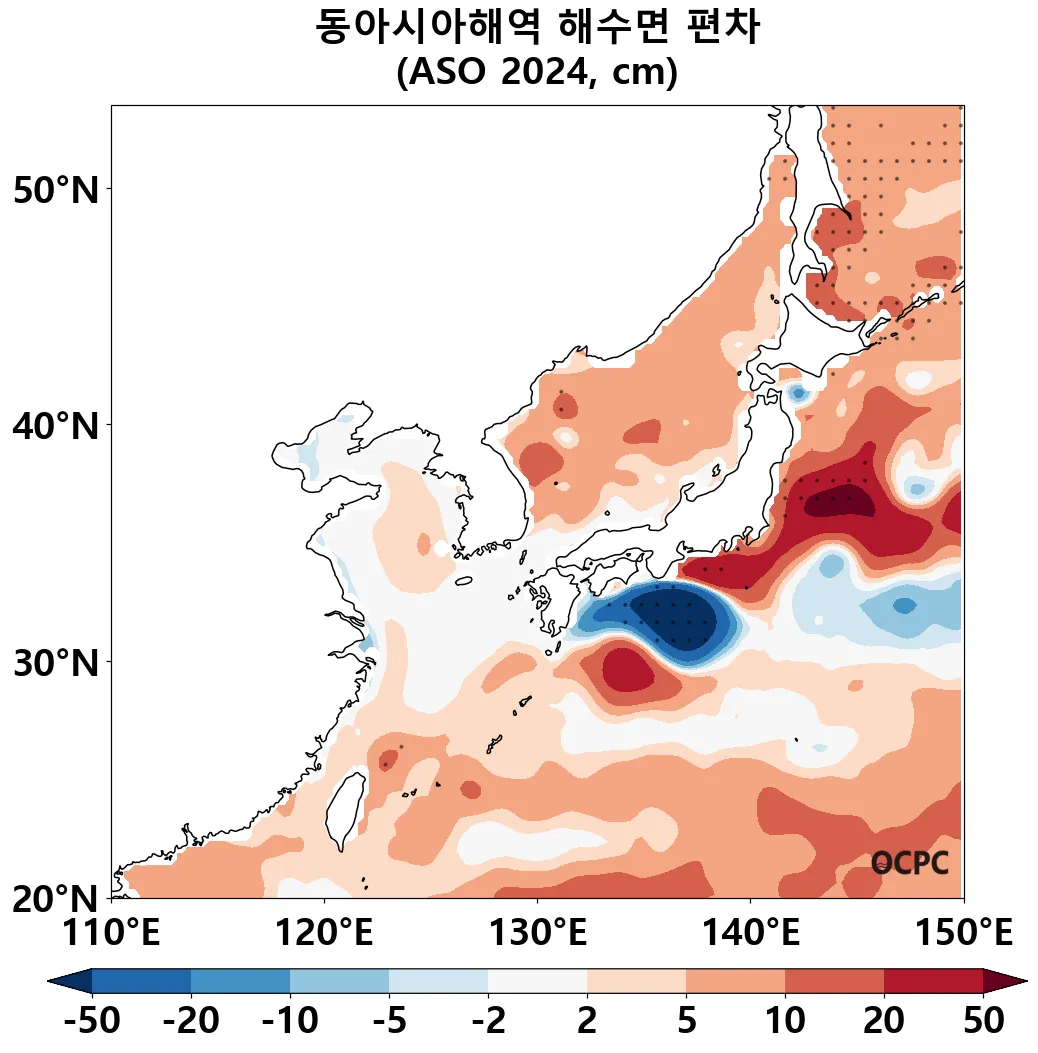 A-B. 동아시아해역 해수면 편차 전망(2024년 8월~10월 평균, 점표시: 평년 ±2 표준편차 초과해역)
