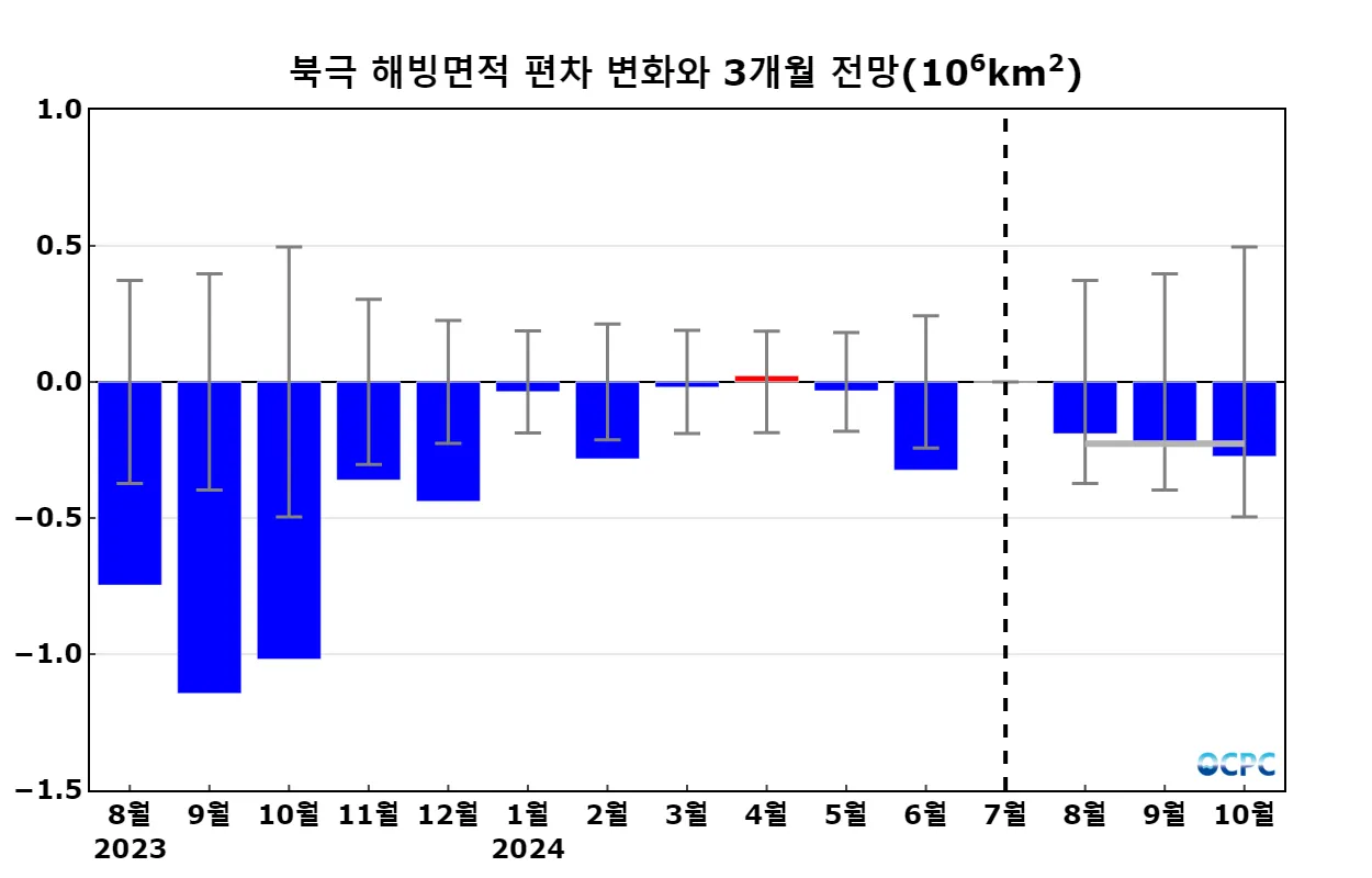 월별 전지구 해상기온 전망에 따르면, 북극 해상기온의 고온현상이 두드러지며, 북극 해빙의 감소 및 북극해 상공의 저기압성 편차에 따른 남풍의 발달이 영향을 미칠 것으로 전망됩니다.