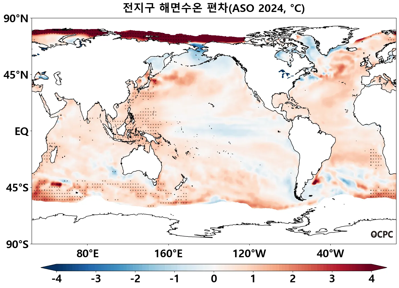 A-B. 전지구 해면수온 편차 전망(2024년 8월~10월 평균, 점표시: 평년 ±2 표준편차 초과해역)