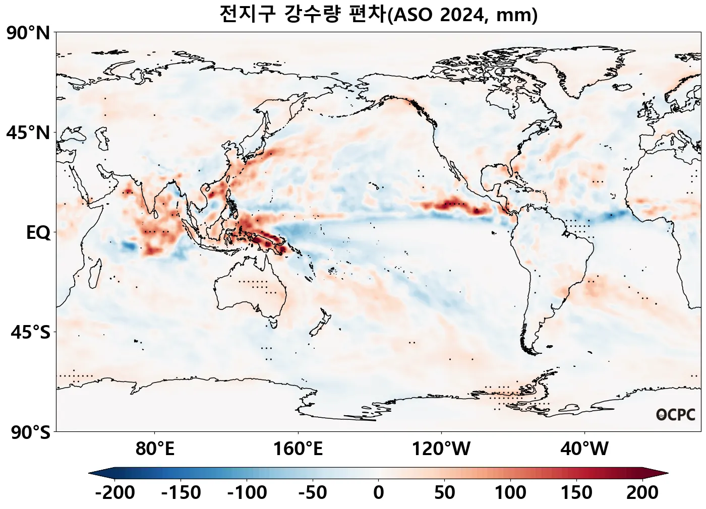 A-B. 전지구 강수량 편차 전망(8월~10월 평균, 점표시: 평년 ±2 표준편차 초과해역)