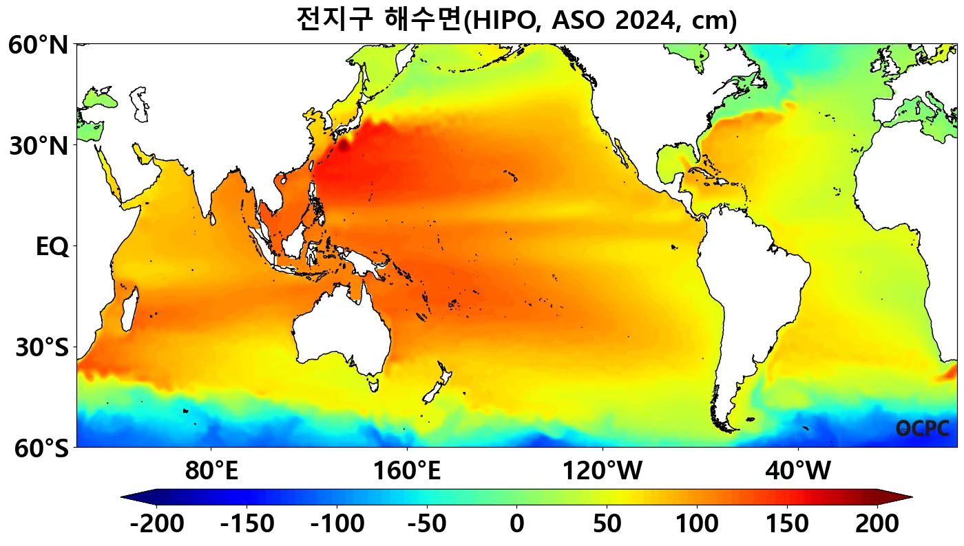 전지구 8~10월 평균 해수면은 평년(59±1cm)보다 높겠으며, 중위도 북동태평양 및 열대 남대서양 해역에서 평년 2 표준편차를 초과하는 높은 해수면 편차가 전망됩니다.