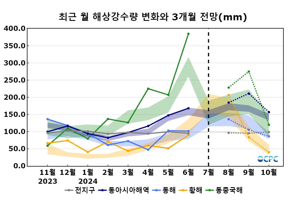 동중국해의 8~10월 평균 해상강수량은 평년(160.2±33.3mm)보다 높겠으며, 동해, 황해의 평균 해상강수량은 평년(117.2±16.4mm, 103.7±21.3mm)과 비슷하겠습니다.
