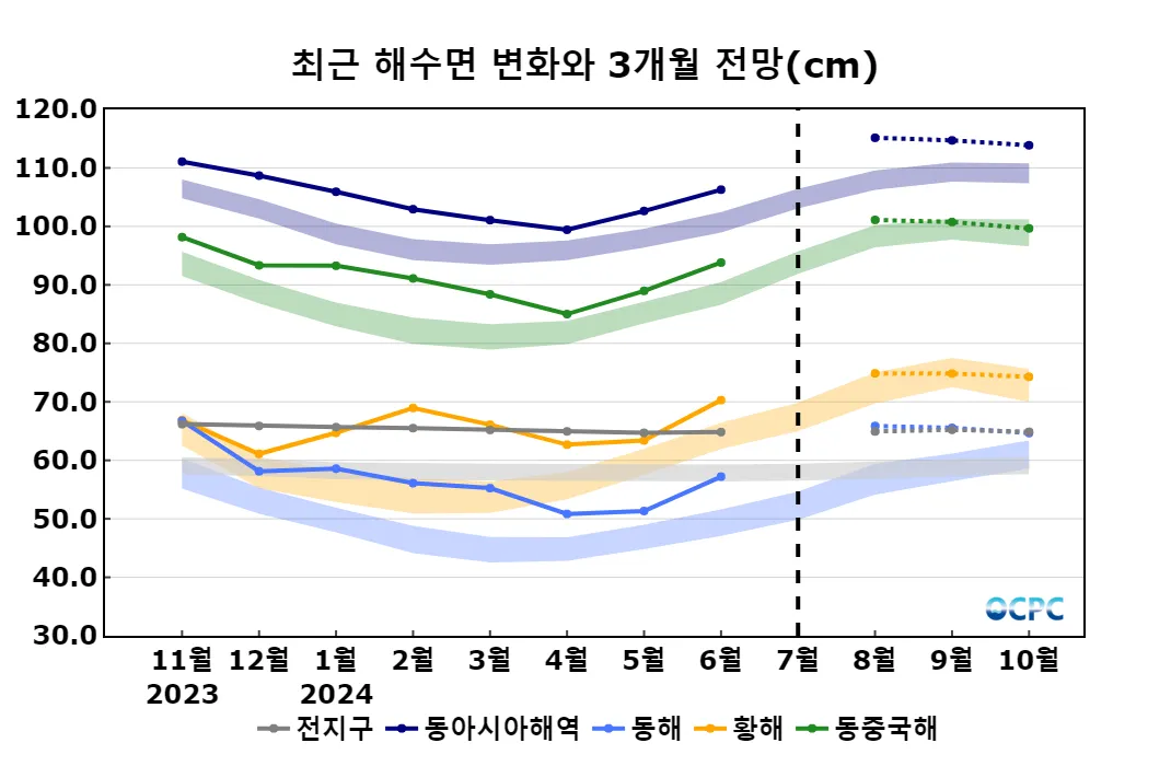 동해의 8~10월 평균 해수면은 평년(59±2cm)보다 높겠으며, 황해, 동중국해의 해수면은 평년(74±2cm, 98±2cm)과 비슷하겠습니다.