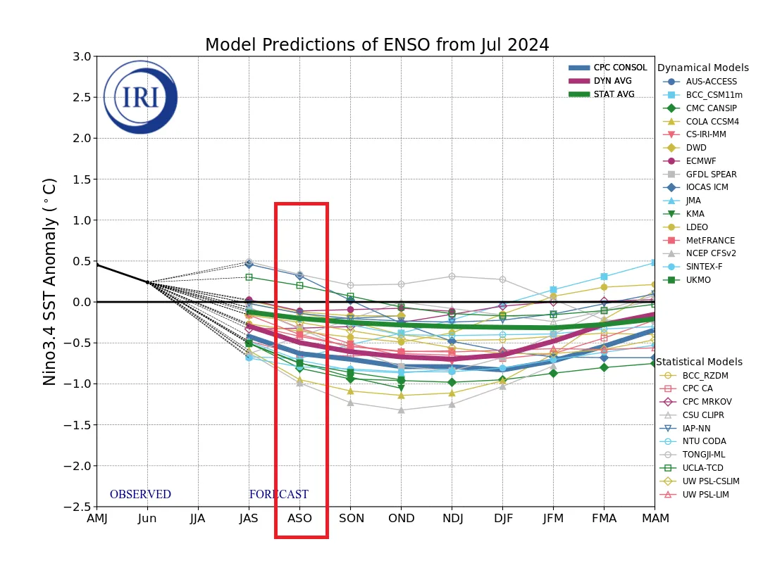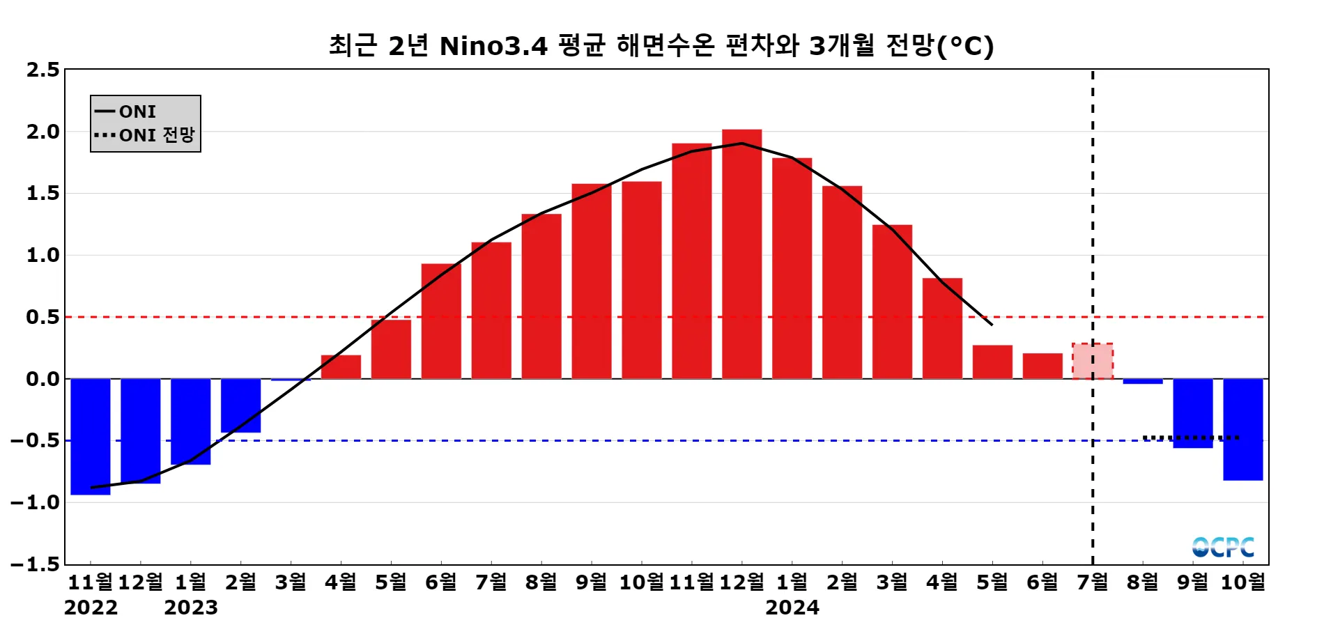 엘니뇨/라니냐 감시구역인 Nino3.4 해역(5°S~5°N, 170°W~120°W)의 7월 1~20일 평균 해면수온 편차는 0.3℃로 중립 상태이며, 8~10월(ASO) 평균 해면수온 편차는 -0.5℃로 전망됩니다. IRI 역학 예측 모형 평균값도 -0.5℃로 라니냐 상태를 전망하고 있습니다.