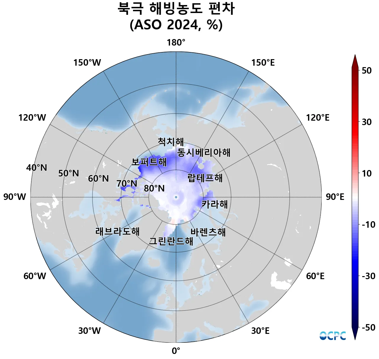 A-B. 북극 해빙농도 편차 전망(2024년 8월~10월 평균, 15% 이상 해역)