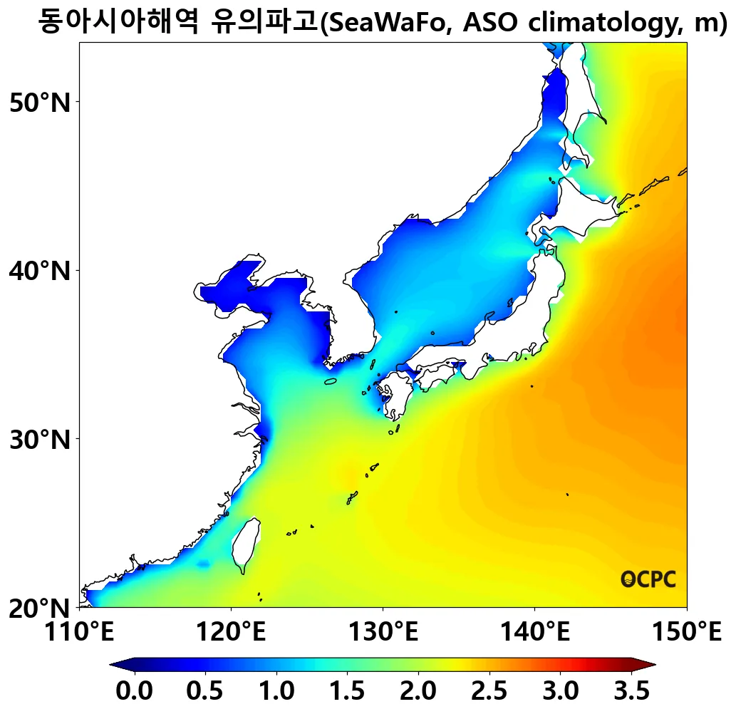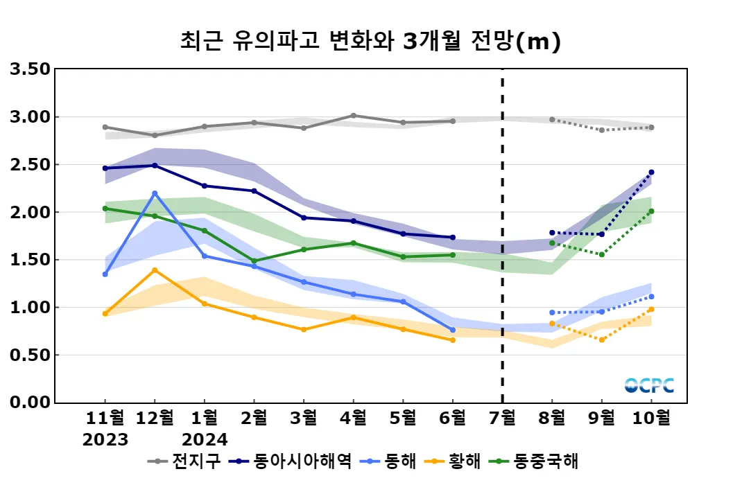 동아시아해역의 8~10월 평균 유의파고는 평년(2.00±0.06m)과 비슷할 것으로 전망됩니다.