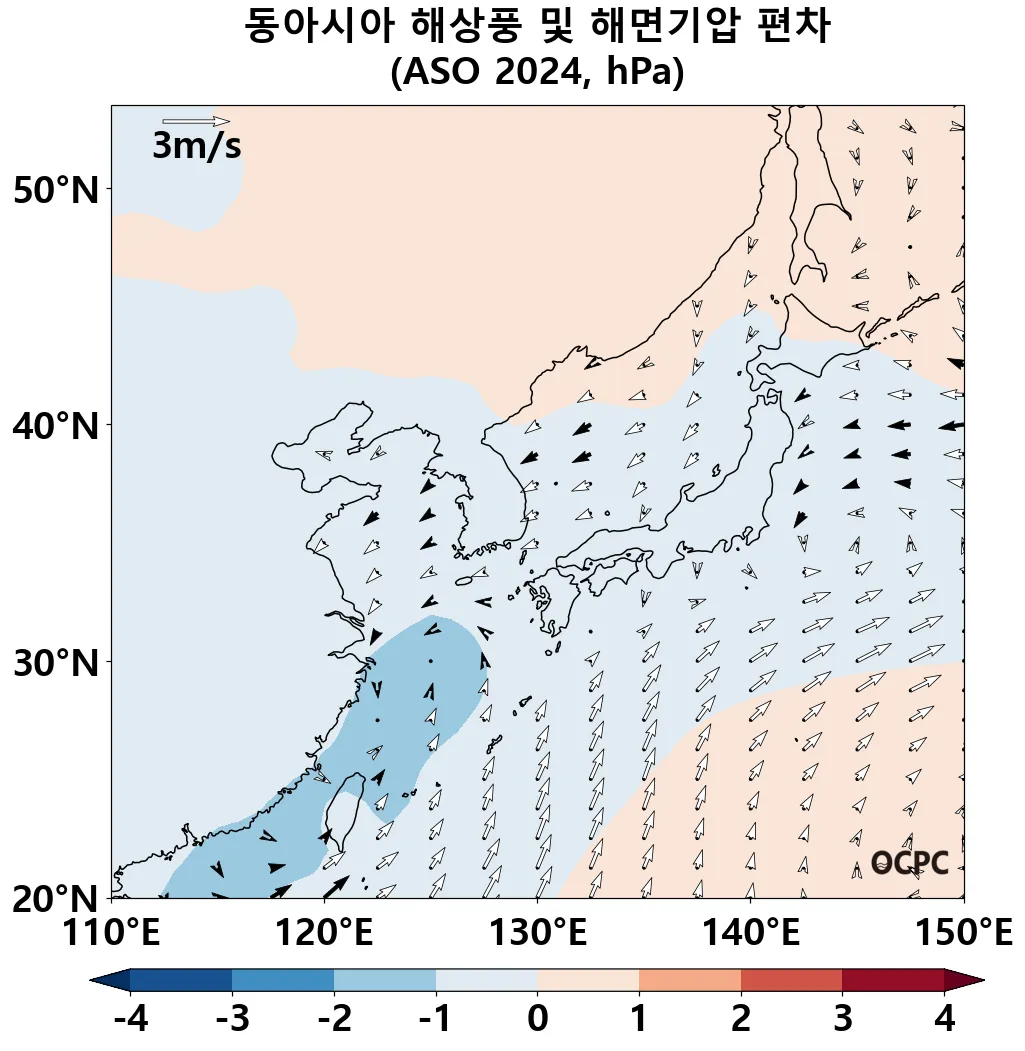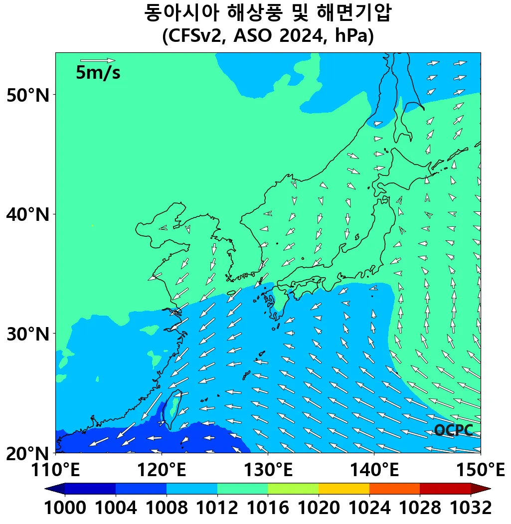 A. 동아시아 해상풍 및 해면기압 전망(2024년 8월~10월 평균)