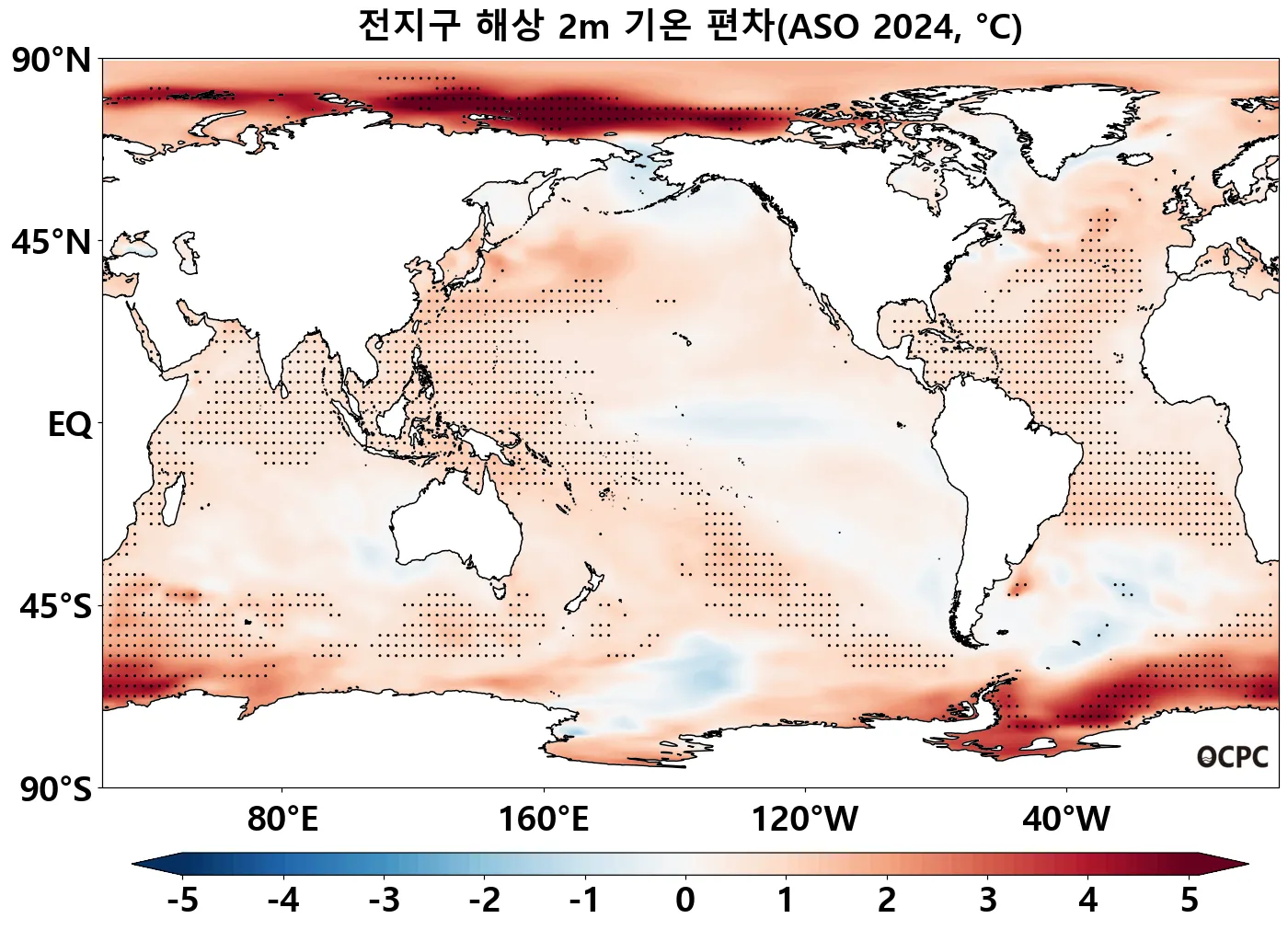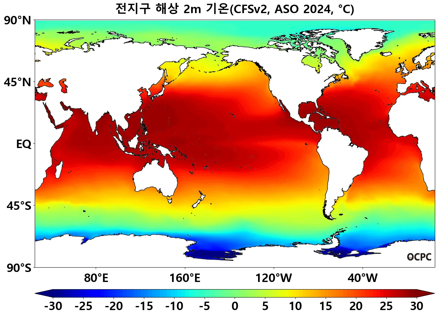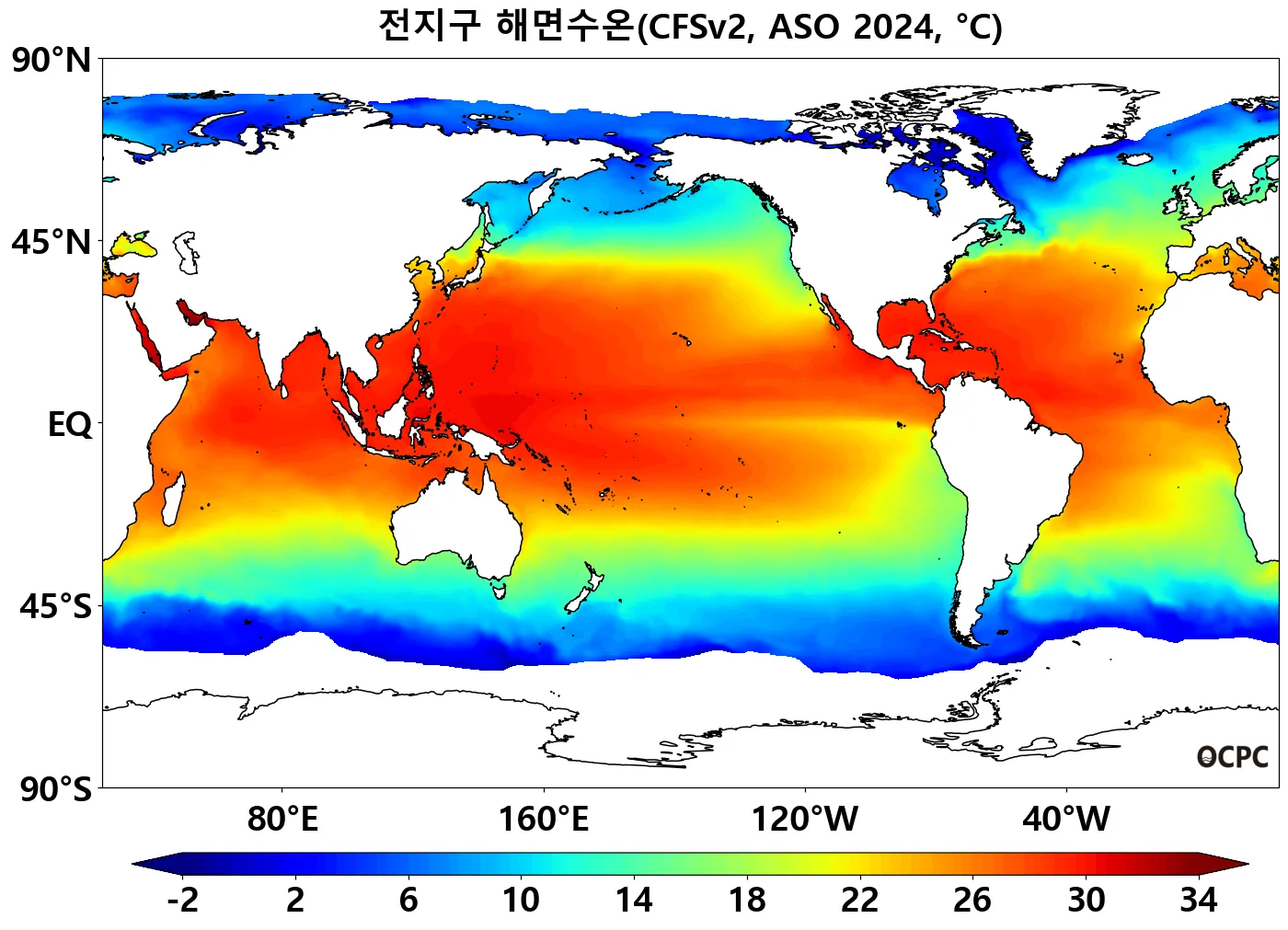 전지구 8~10월 평균 해상기온은 평년(16.6±0.1℃)보다 높겠으며, 극해역, 열대 서태평양, 인도양, 대서양을 중심으로 평년보다 높은 기온이 전망됩니다.