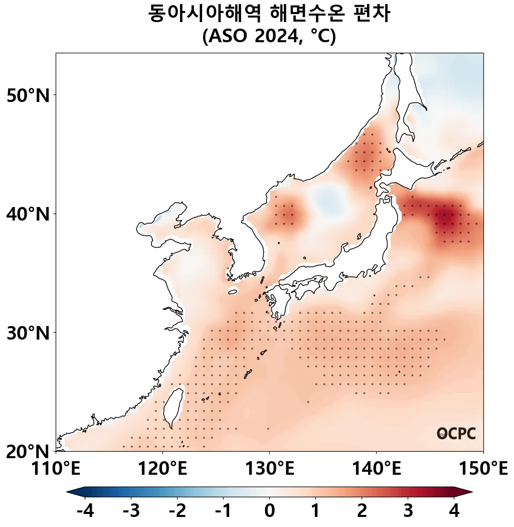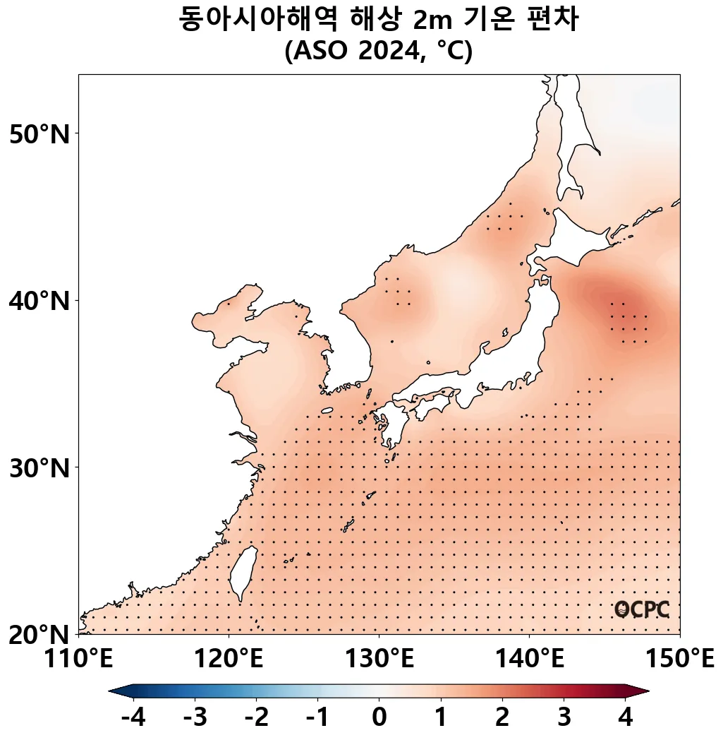 A-B. 동아시아해역 해상기온 편차 전망(2024년 8월~10월 평균, 점표시: 평년 ±2 표준편차 초과해역)