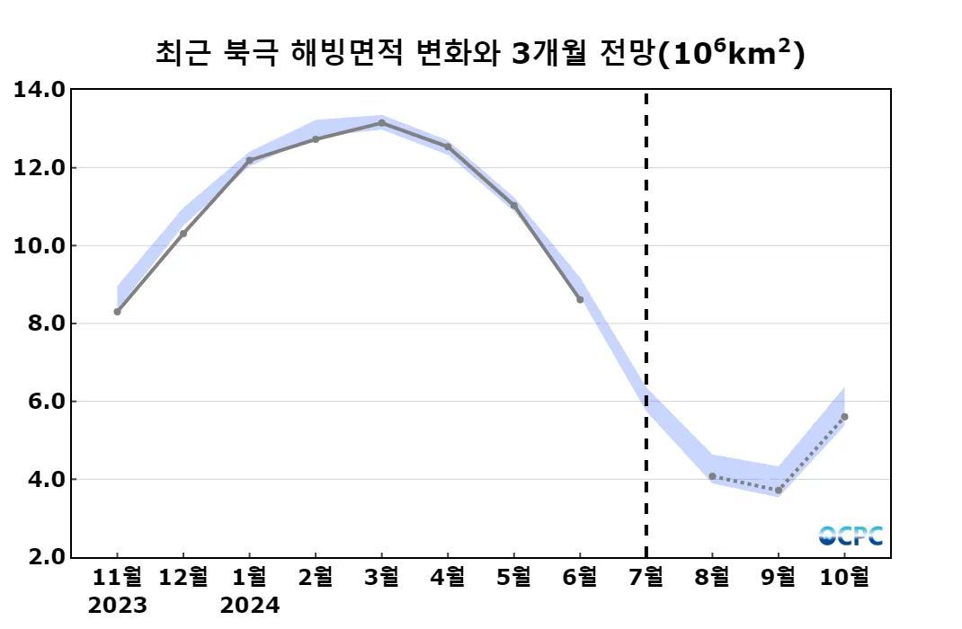 북극 해빙은 평균적으로 9월에 연중 최저치를 기록합니다. 8~10월 북극 해빙의 감소는 평년과 유사할 것으로 전망되나, 지난 6월에 폴리냐가 발달한 랍테프해 및 동시베리아해에 해빙 감소가 빠르게 진행되고 있으며, 북극 지역 해면에 고수온 현상이 나타나고 있어, 해빙 감소가 예상보다 더 빠르게 진행될 수 있습니다.