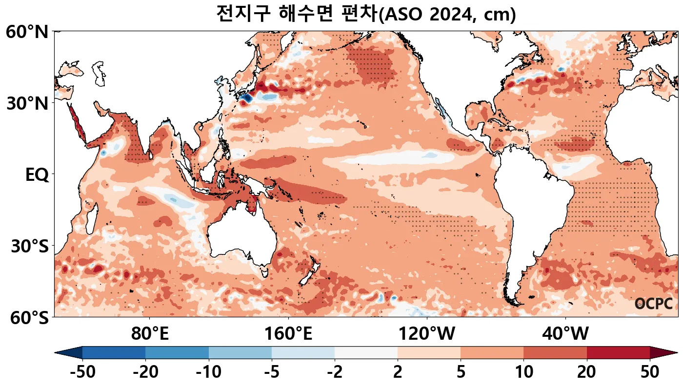 A-B. 전지구 해수면 편차 전망(2024년 8월~10월 평균, 점표시: 평년 ±2 표준편차 초과해역)