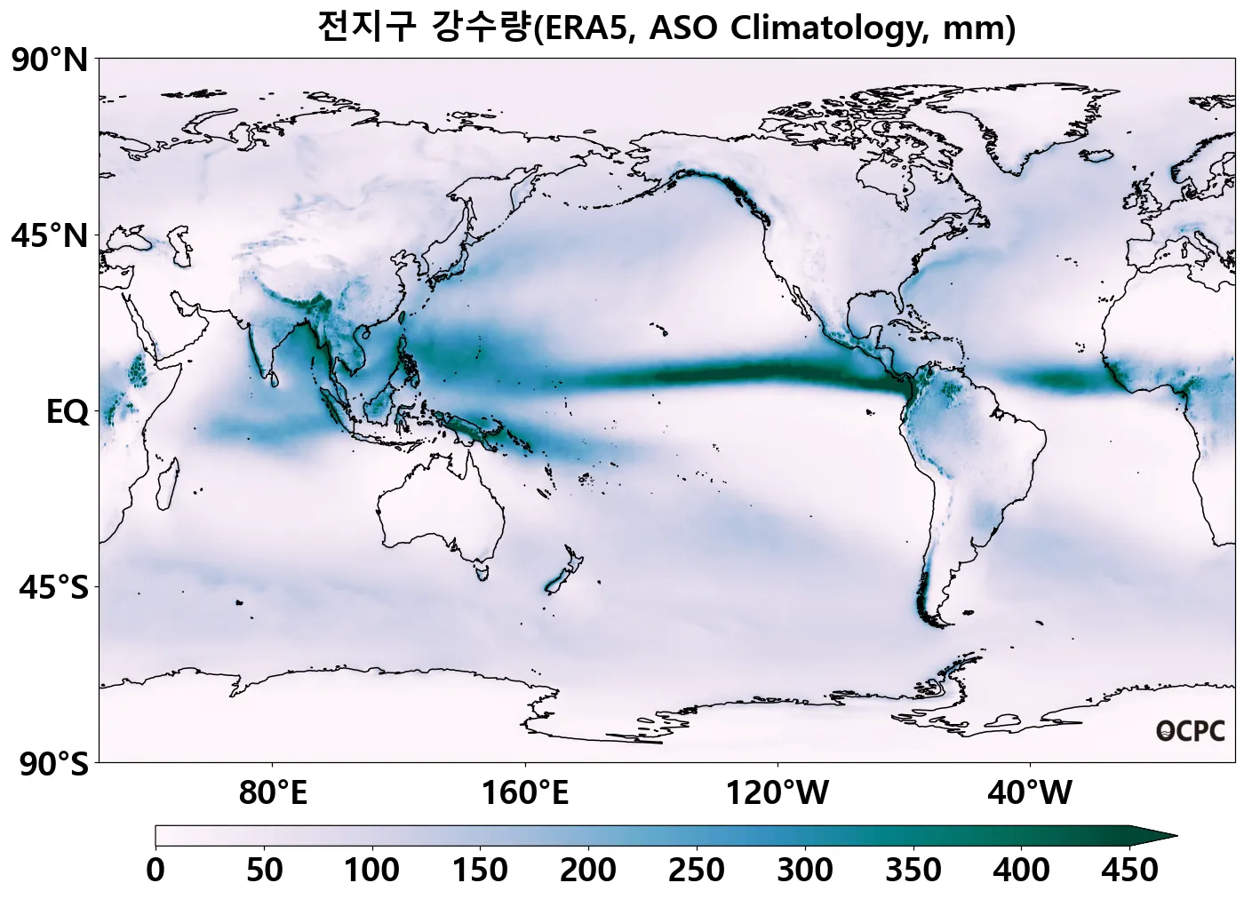 전지구 8~10월 평균 해상강수량은 평년(97.5±1.4mm)과 비슷하겠습니다.