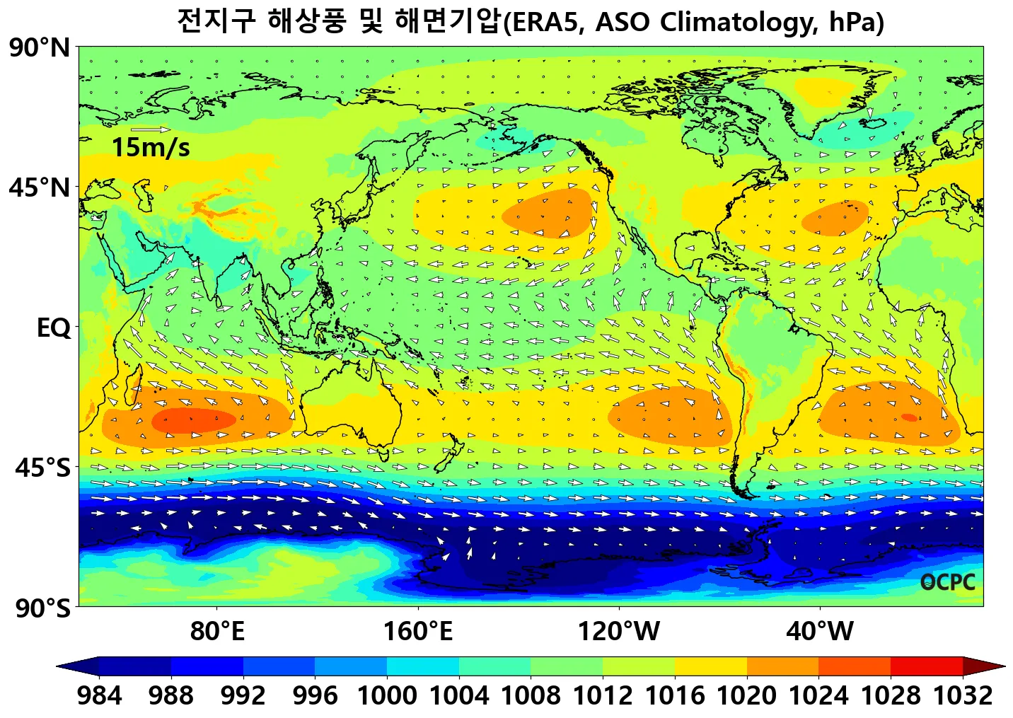 B. 전지구 해상풍 및 해면기압(평년 8월~10월 평균)