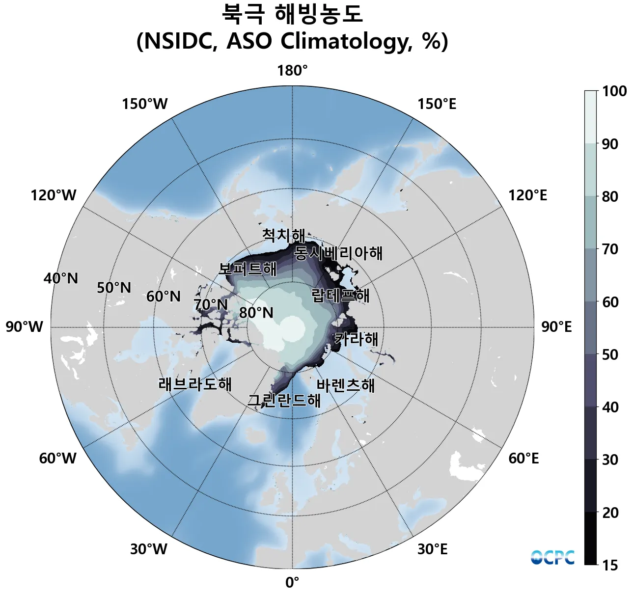 B. 북극 해빙농도(평년 8월~10월 평균, 15% 이상 해역)