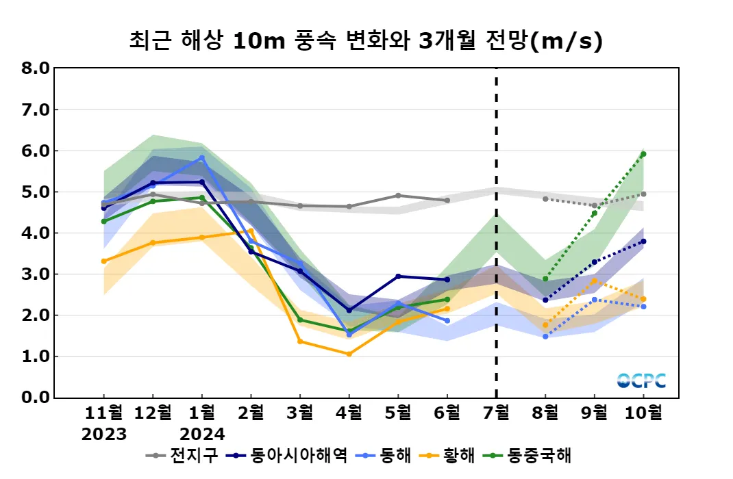 동아시아해역의 8~10월 평균 해상풍은 평년(3.1±0.2m/s)과 비슷하겠습니다.