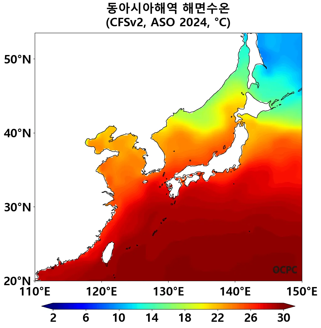 A. 동아시아해역 해상기온 전망(2024년 8월~10월 평균)
