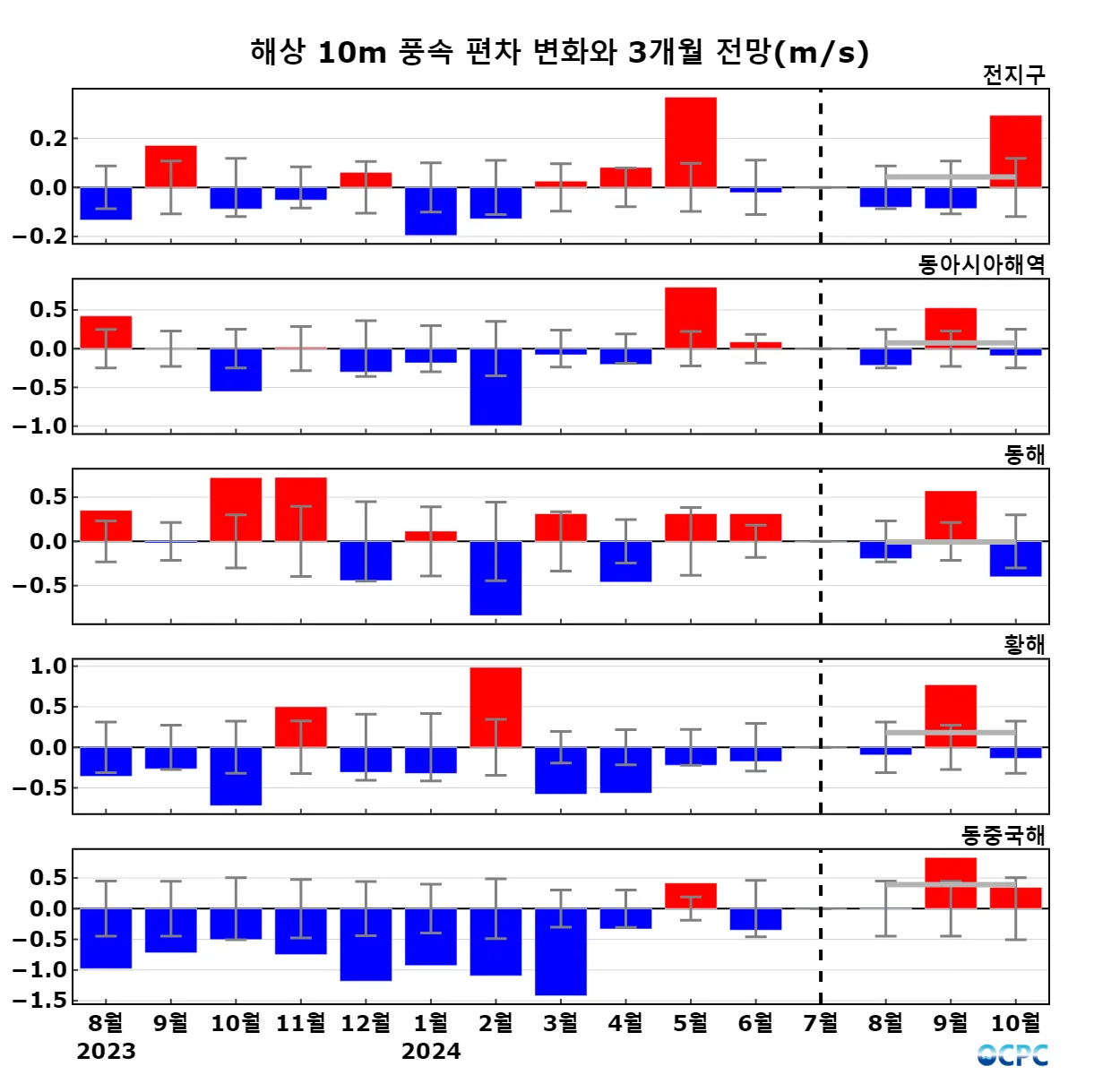 동해, 황해, 동중국해의 8~10월 평균 해상풍은 평년(2.0±0.2m/s, 2.2±0.3m/s, 4.0±0.5m/s)과 비슷하겠습니다.
