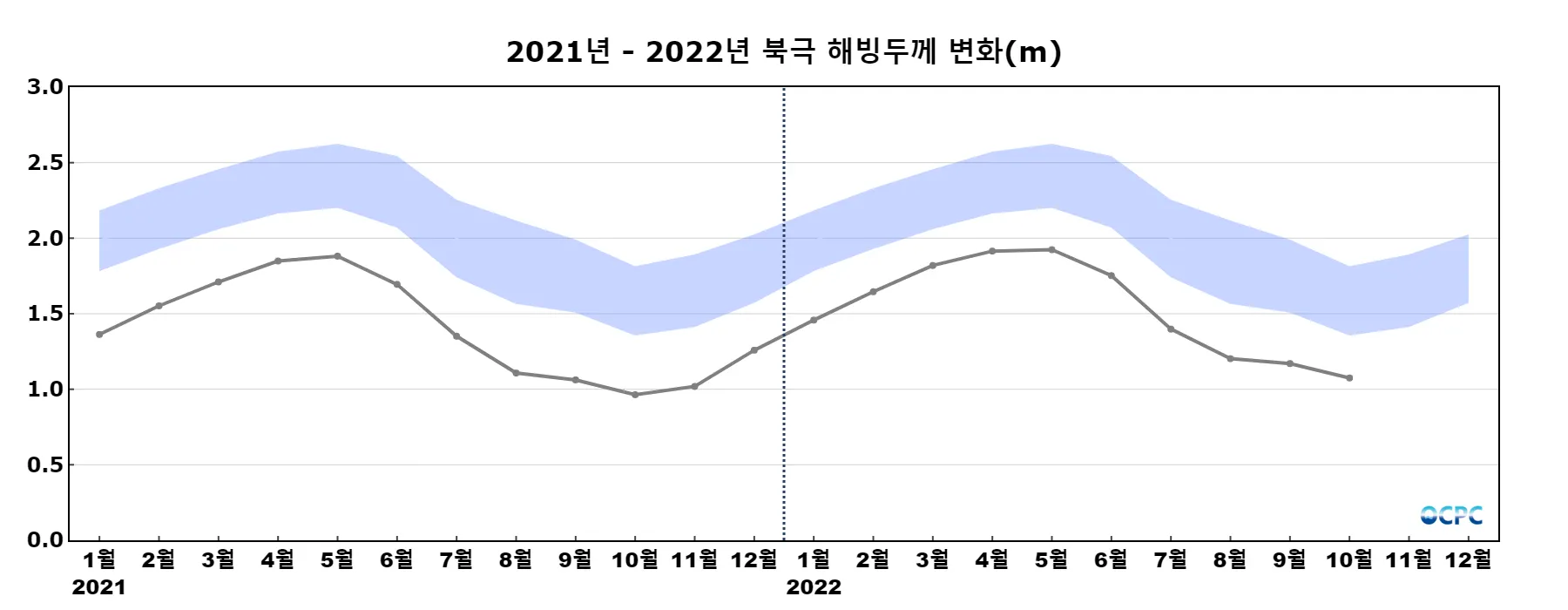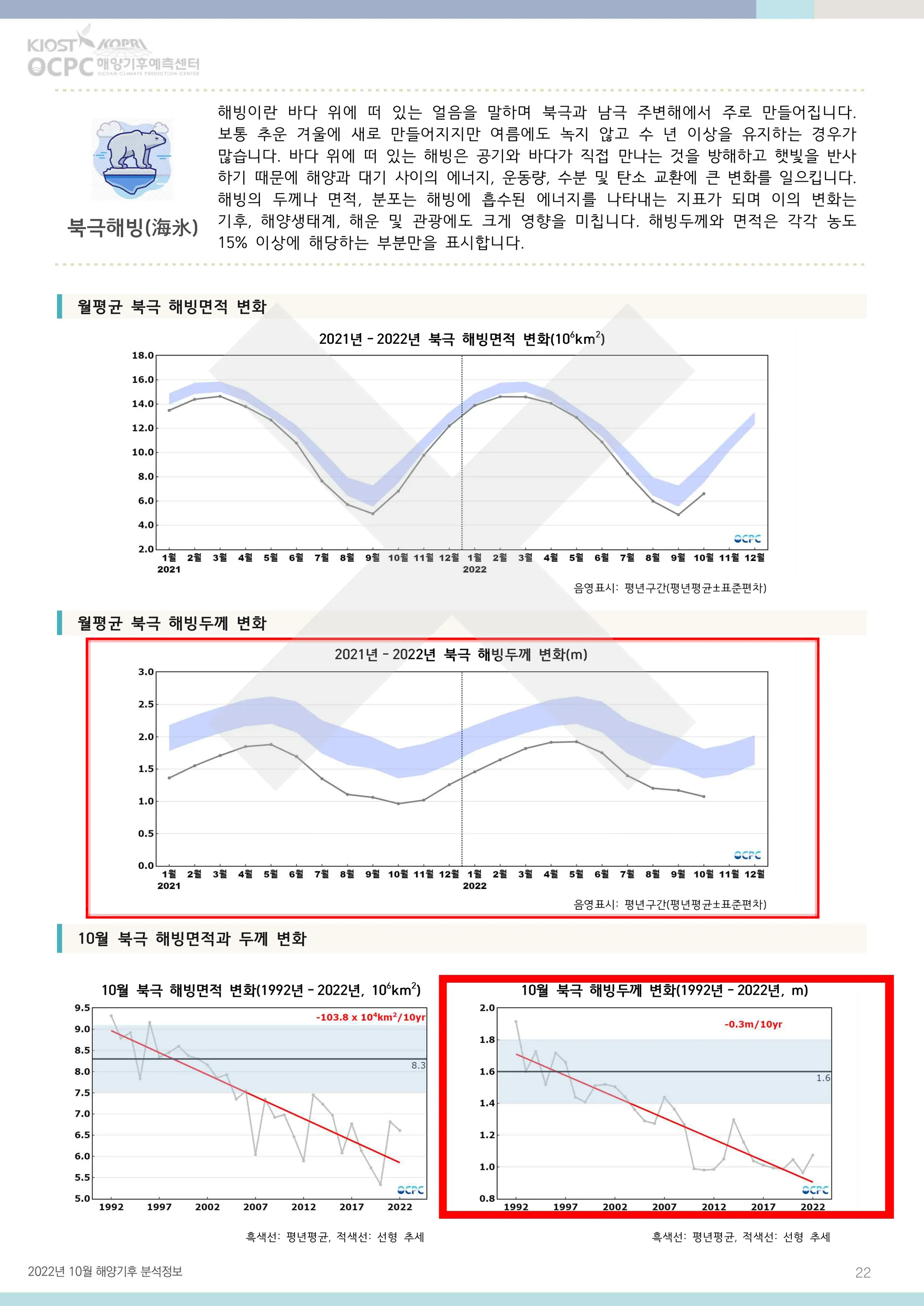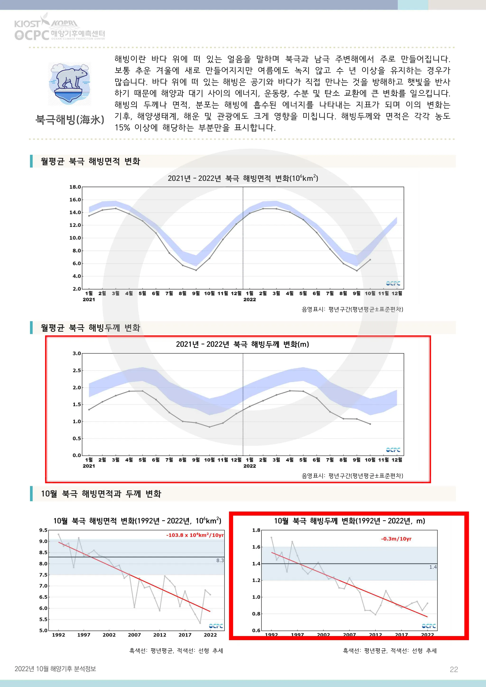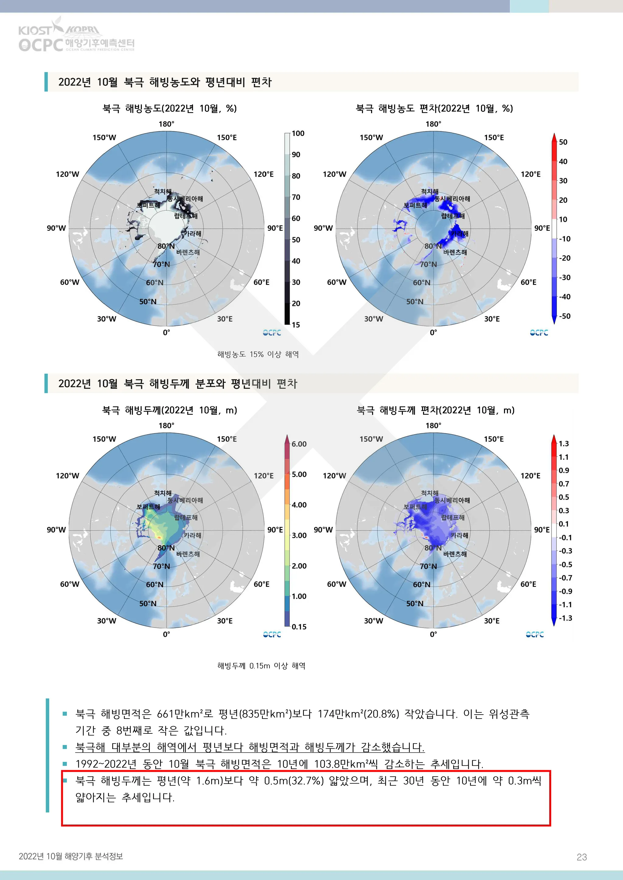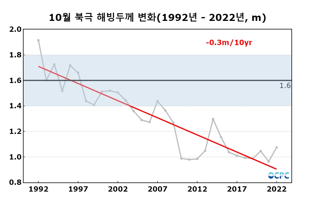 북극 해빙두께는 평년(약 1.6m)보다 약 0.5m(32.7%) 얇았으며, 최근 30년 동안 10년에 약 0.3m씩 얇아지는 추세입니다.