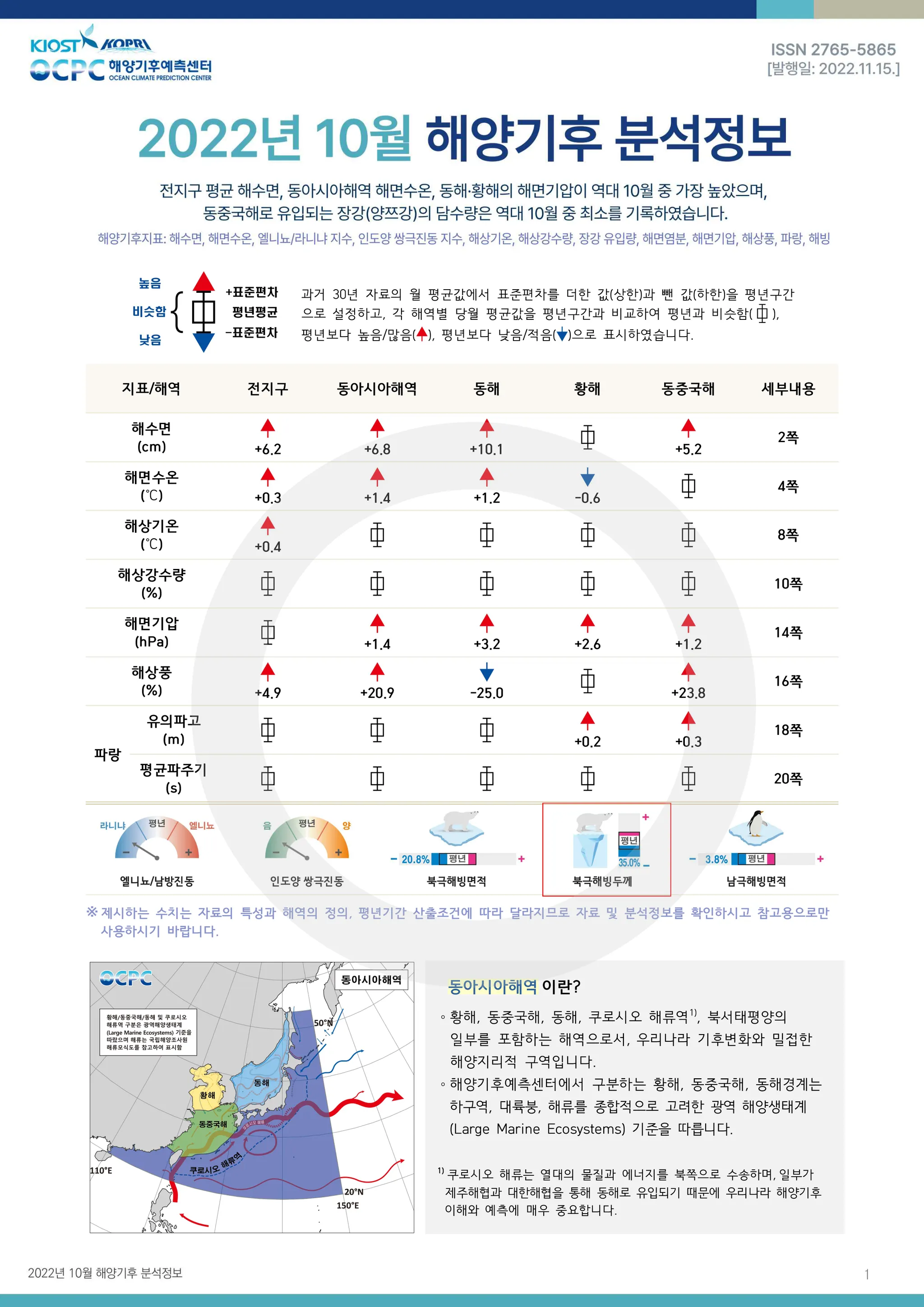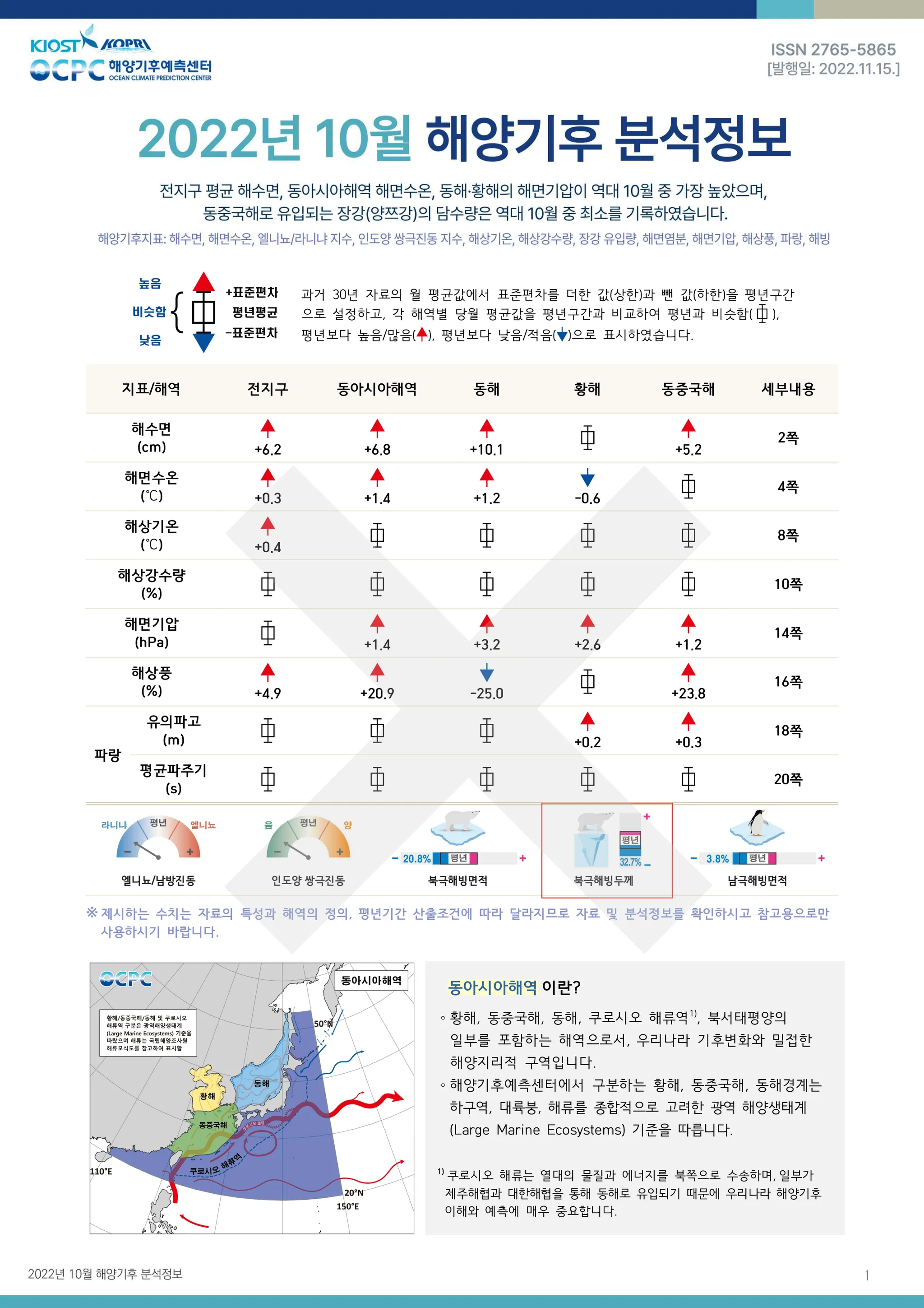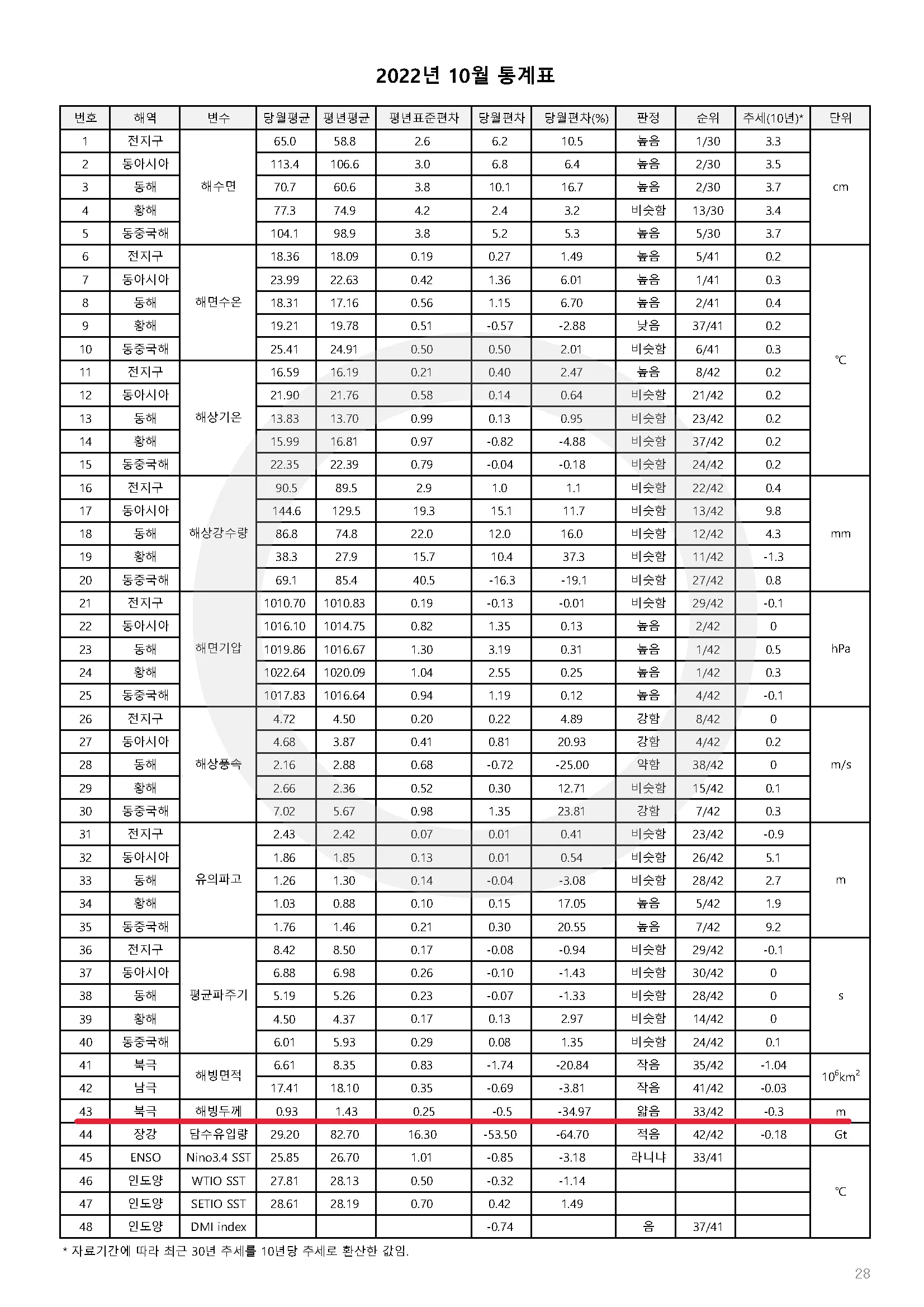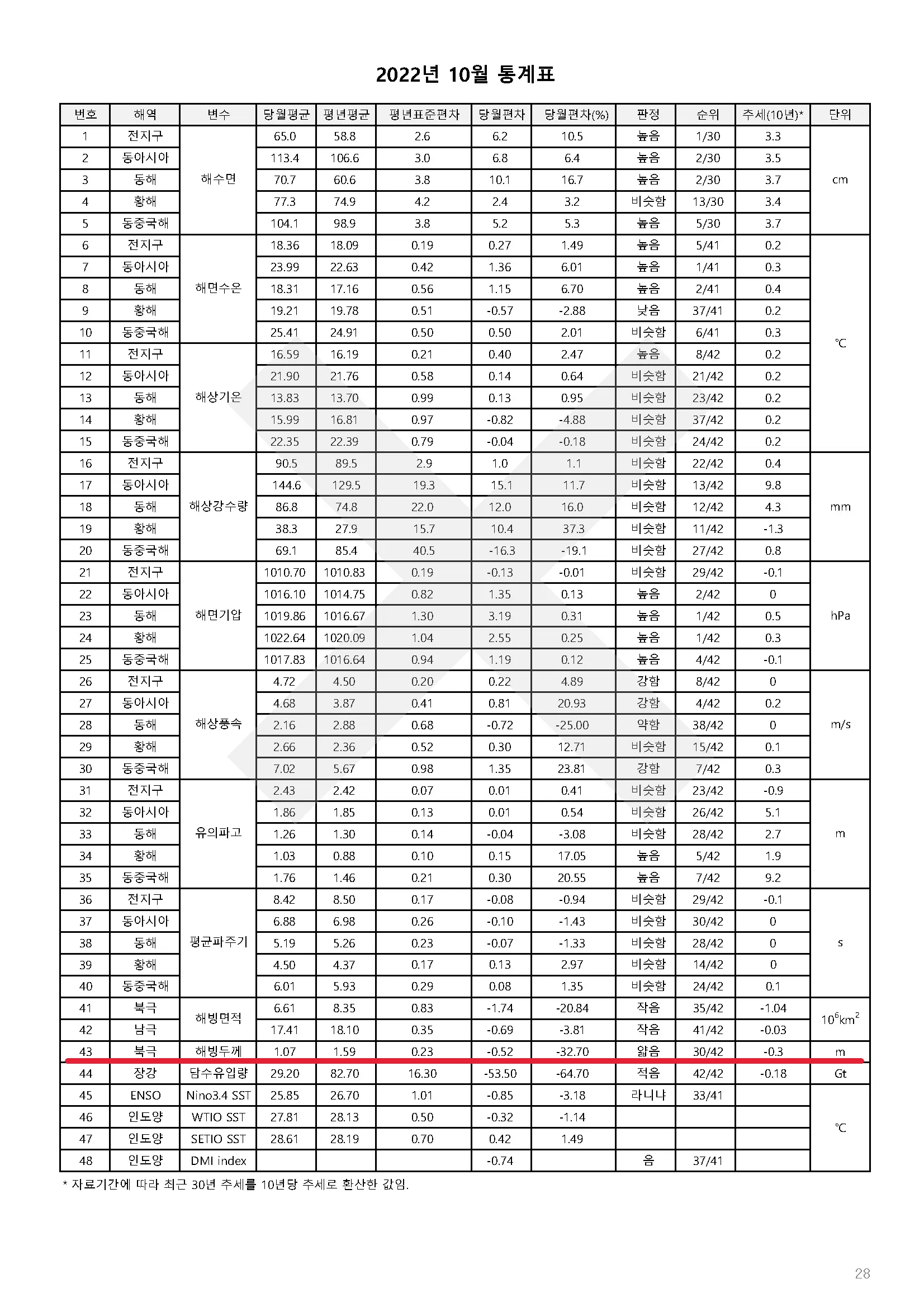북극 해빙두께는 평년(약 1.6m)보다 약 0.5m(32.7%) 얇았으며, 최근 30년 동안 10년에 약 0.3m씩 얇아지는 추세입니다.