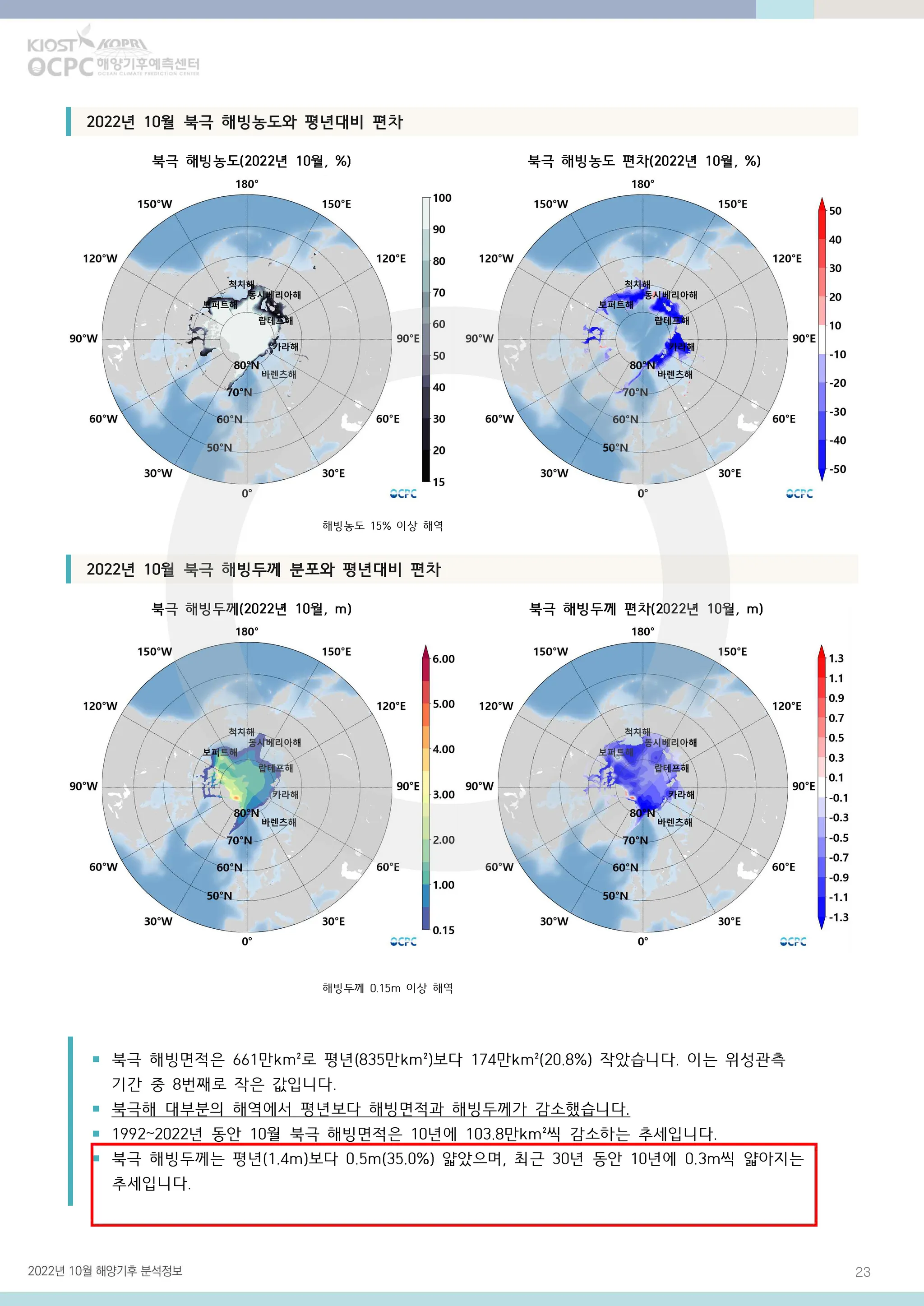 북극 해빙두께는 평년(1.4m)보다 0.5m(35.0%) 얇았으며, 최근 30년 동안 10년에 0.3m씩 얇아지는 추세입니다.
